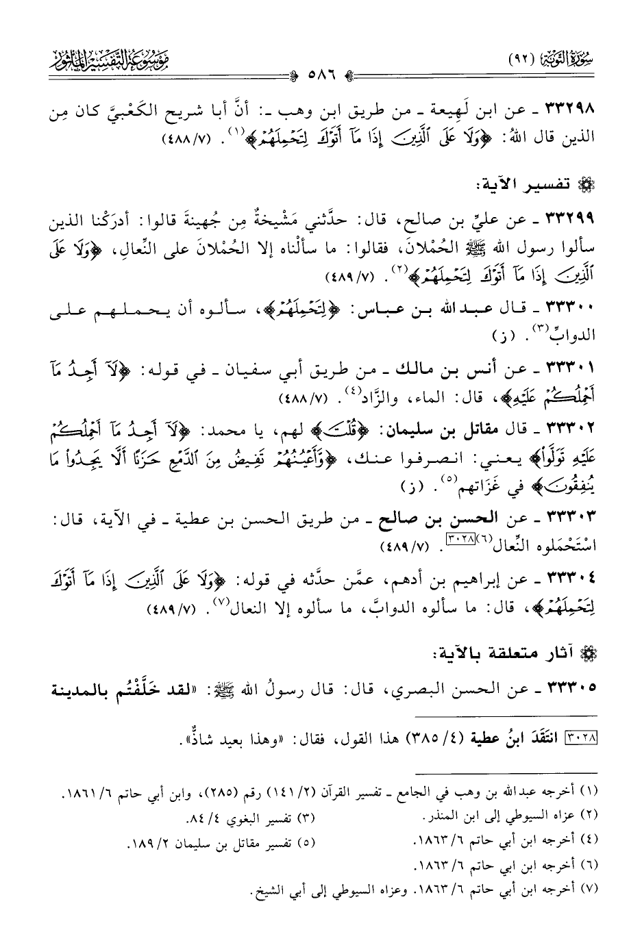 ٣٣٣٠٠ - قال عبد الله بن عباس: {لتحملهم}، سألوه أن يحملهم على الدوابِّ (¬٣). (ز)