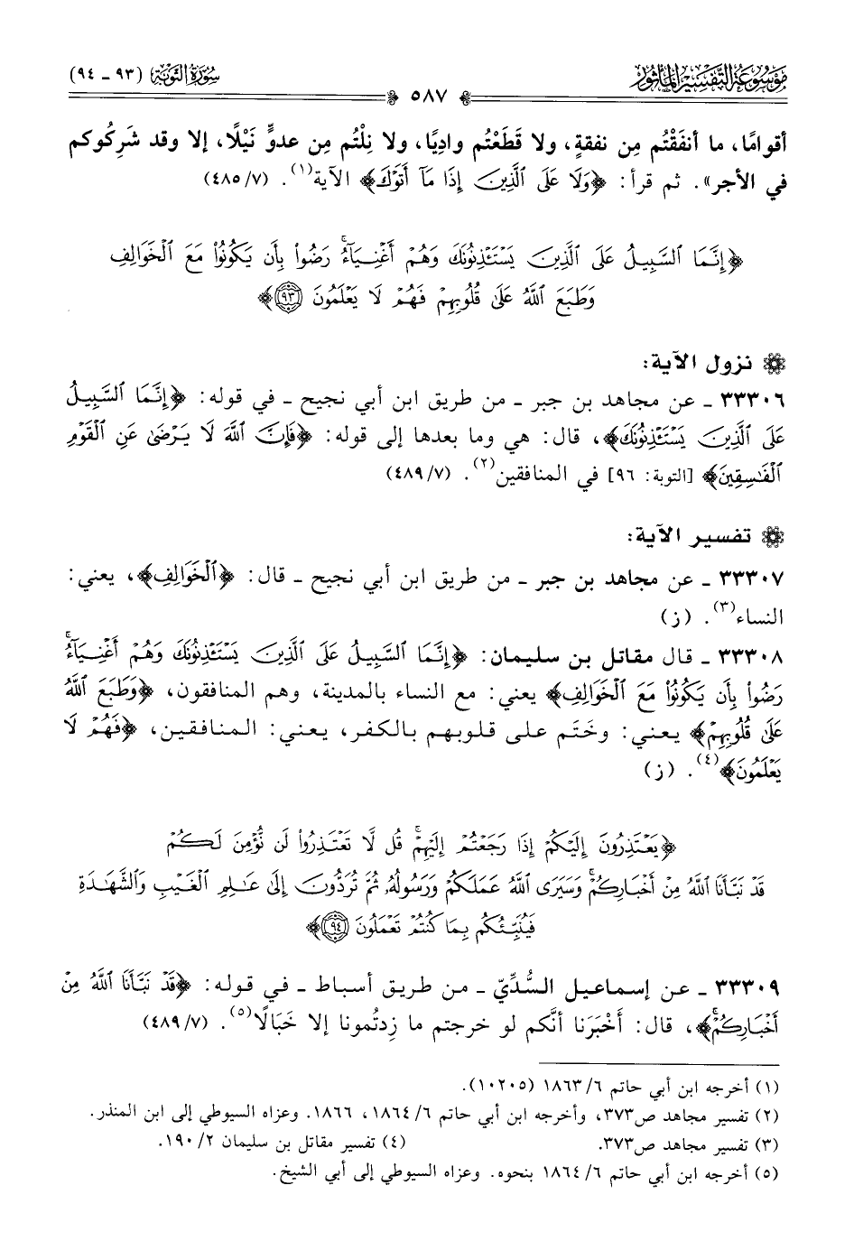 ٣٣٣٠٦ - عن مجاهد بن جبر -من طريق ابن أبي نجيح- في قوله: {إنما السبيل على الذين يستئذنونك}، قال: هي وما بعدها إلى قوله: {فإن الله لا يرضى عن القوم الفاسقين} في المنافقين (¬٢). (٧/ ٤٨٩)