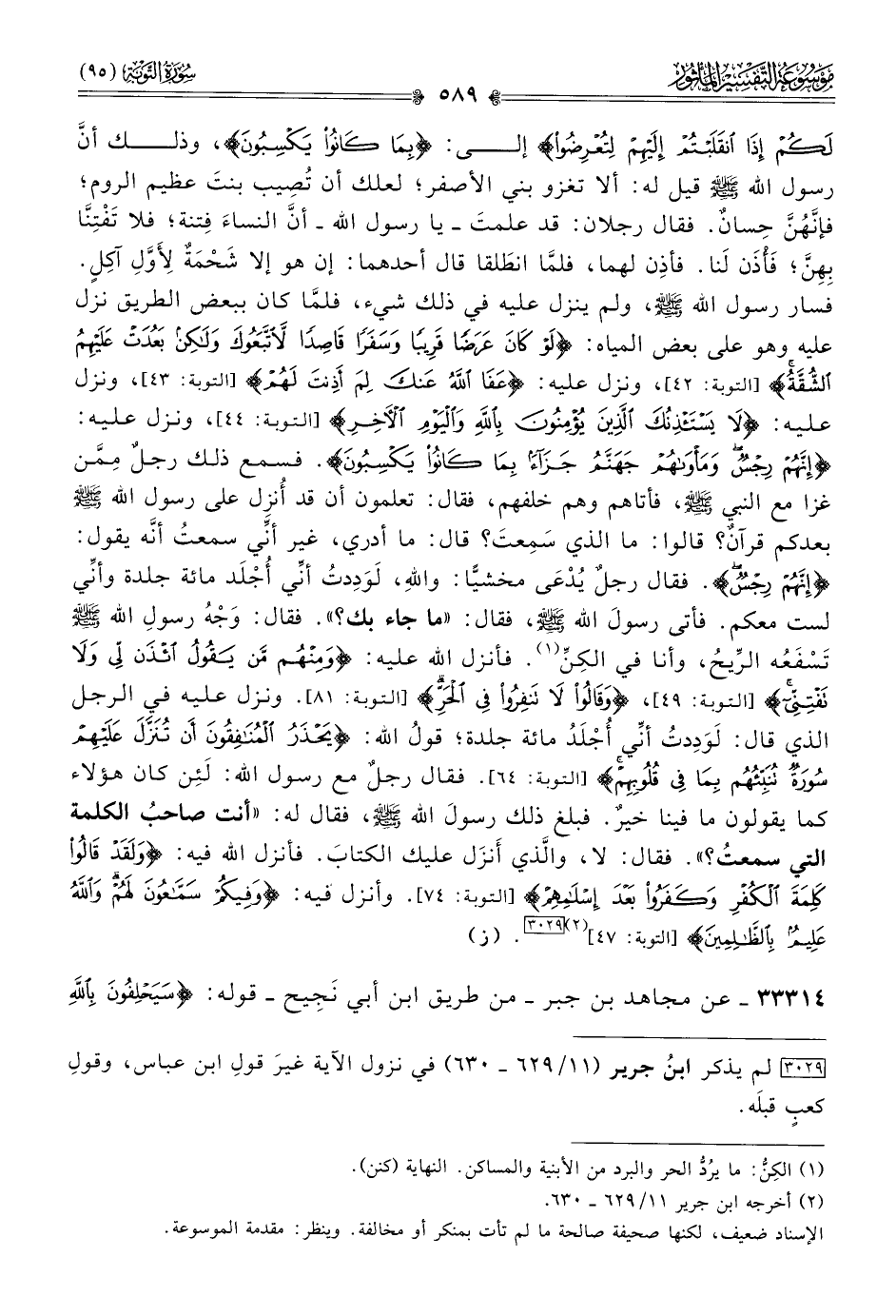 لكم إذا انقلبتم إليهم لتعرضوا} إلى: {بما كانوا يكسبون}، وذلك أنّ رسول الله - صلى الله عليه وسلم - قيل له: ألا تغزو بني الأصفر؛ لعلك أن تُصِيب بنتَ عظيم الروم؛ فإنّهُنَّ حِسانٌ. فقال رجلان: قد علمتَ -يا رسول الله- أنّ النساءَ فِتنة؛ فلا تَفْتِنّا بِهِنَّ؛ فَأْذَن لَنا. فأذِن لهما، فلمّا انطَلقا قال أحدهما: إن هو إلا شَحْمَةٌ لِأَوَّلِ آكِلٍ. فسار رسول الله - صلى الله عليه وسلم -، ولم ينزل عليه في ذلك شيء، فلمّا كان ببعض الطريق نزل عليه وهو على بعض المياه: {لو كان عرضا قريبا وسفرا قاصدا لاتبعوك ولكن بعدت عليهم الشقة} [التوبة: ٤٢]، ونزل عليه: {عفا الله عنك لم أذنت لهم} [التوبة: ٤٣]، ونزل عليه: {لا يستأذنك الذين يؤمنون بالله واليوم الآخر} [التوبة: ٤٤]، ونزل عليه: {إنهم رجس ومأواهم جهنم جزاء بما كانوا يكسبون}. فسمع ذلك رجلٌ مِمَّن غزا مع النبي - صلى الله عليه وسلم -، فأتاهم وهم خلفهم، فقال: تعلمون أن قد أُنزِل على رسول الله - صلى الله عليه وسلم - بعدكم قرآنٌ؟ قالوا: ما الذي سَمِعتَ؟ قال: ما أدري، غير أنِّي سمعتُ أنّه يقول: {إنهم رجس}. فقال رجلٌ يُدْعى مخشيًّا: واللهِ، لَوَدِدتُ أنِّي أُجْلَد مائة جلدة وأنِّي لست معكم. فأتى رسولَ الله - صلى الله عليه وسلم -، فقال: «ما جاء بك؟». فقال: وجْهُ رسولِ الله - صلى الله عليه وسلم - تَسْفَعُه الرِّيحُ، وأنا في الكِنِّ (¬١). فأنزل الله عليه: {ومنهم من يقول ائذن لي ولا تفتني} [التوبة: ٤٩]، {وقالوا لا تنفروا في الحر} [التوبة: ٨١]. ونزل عليه في الرجل الذي قال: لَوَدِدتُ أنِّي أُجْلَدُ مائة جلدة؛ قولُ الله: {يحذر المنافقون أن تنزل عليهم سورة تنبئهم بما في قلوبهم} [التوبة: ٦٤]. فقال رجلٌ مع رسول الله: لَئِن كان هؤلاء كما يقولون ما فينا خيرٌ. فبلغ ذلك رسولَ الله - صلى الله عليه وسلم -، فقال له: «أنت صاحبُ الكلمة التي سمعتُ؟». فقال: لا، والَّذي أنزَل عليك الكتابَ. فأنزل الله فيه: {ولقد قالوا كلمة الكفر وكفروا بعد إسلامهم} [التوبة: ٧٤]. وأنزل فيه: {وفيكم سماعون لهم والله عليم بالظالمين} [التوبة: ٤٧] (¬٢) [٣٠٢٩]. (ز)