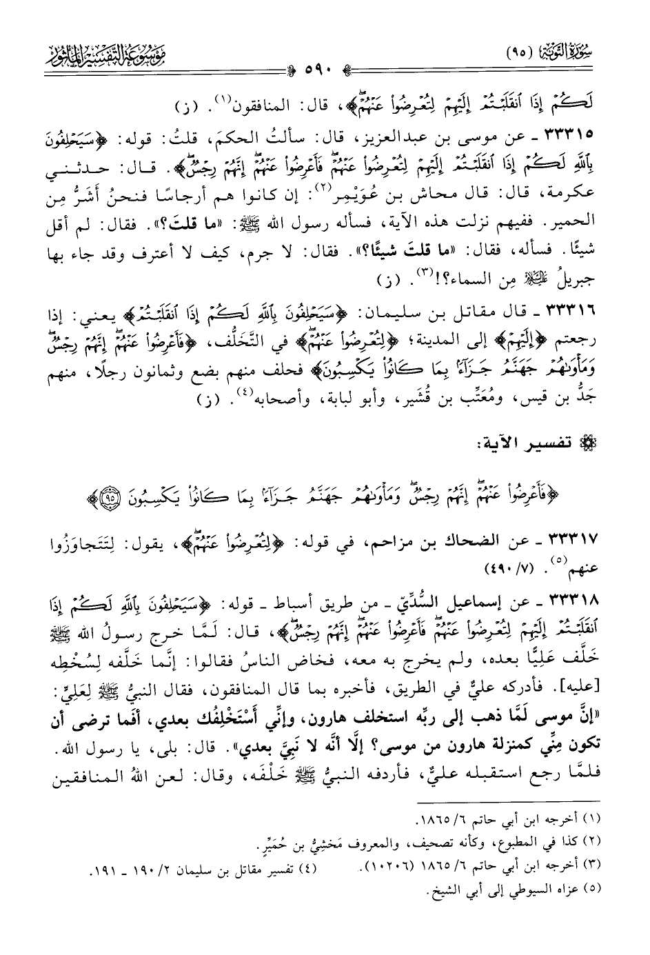 ٣٣٣١٨ - عن إسماعيل السُّدِّيّ -من طريق أسباط- قوله: {سيحلفون بالله لكم إذا انقلبتم إليهم لتعرضوا عنهم فأعرضوا عنهم إنهم رجس}، قال: لَمّا خرج رسولُ الله - صلى الله عليه وسلم - خَلَّف عَلِيًّا بعده، ولم يخرج به معه، فخاض الناسُ فقالوا: إنّما خَلَّفه لِسُخْطِه [عليه]. فأدركه عليٌّ في الطريق، فأخبره بما قال المنافقون، فقال النبيُّ - صلى الله عليه وسلم - لِعَلِيٍّ: «إنّ موسى لَمّا ذهب إلى ربِّه استخلف هارون، وإنِّي أسْتَخْلِفُك بعدي، أفَما ترضى أن تكون مِنِّي كمنزلة هارون من موسى؟ إلّا أنّه لا نَبِيَّ بعدي». قال: بلى، يا رسول الله. فلمّا رجع استقبله عليٌّ، فأردفه النبيُّ - صلى الله عليه وسلم - خَلْفَه، وقال: لعن اللهُ المنافقين