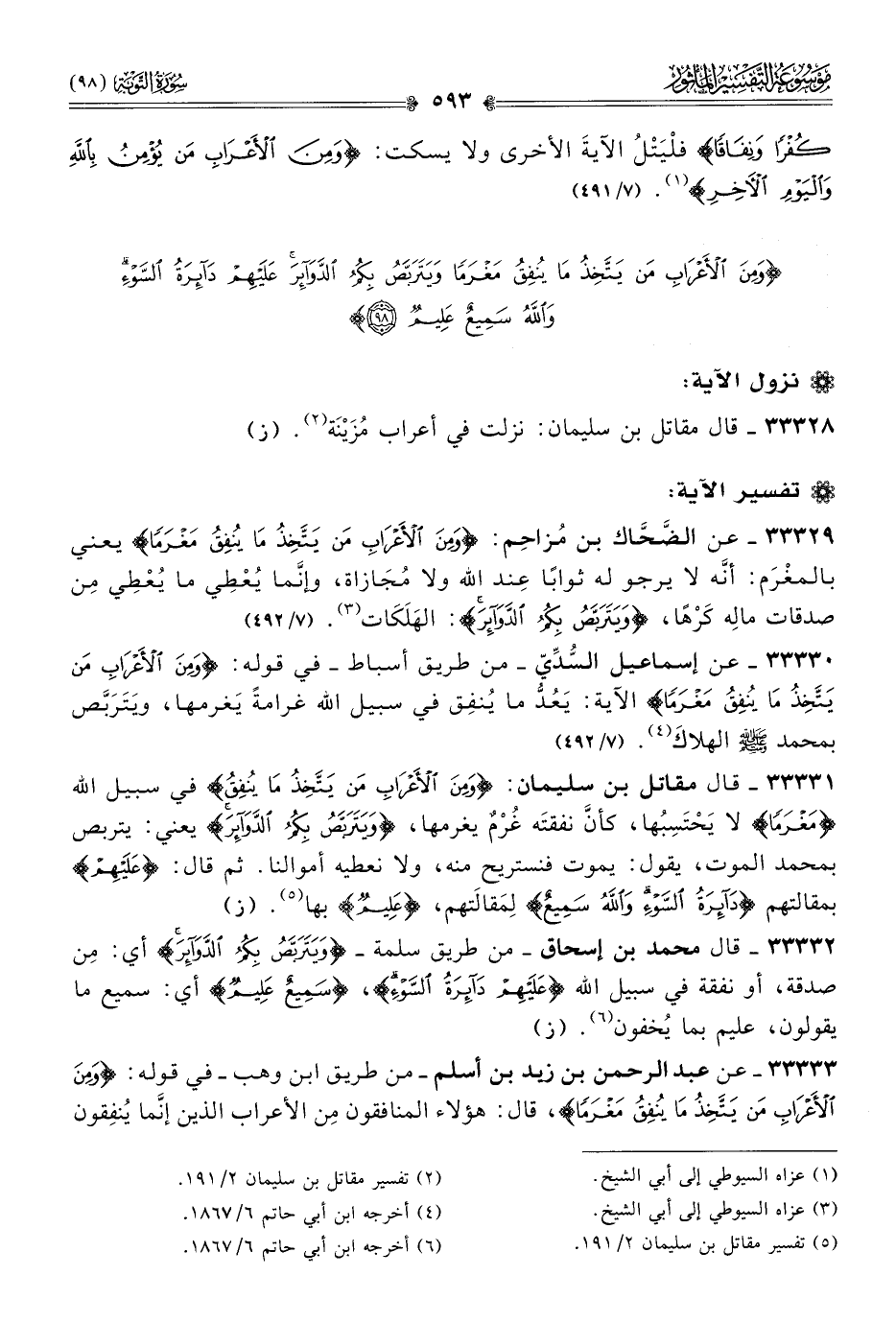 ٣٣٣٢٩ - عن الضَّحّاك بن مُزاحِم: {ومن الأعراب من يتخذ ما ينفق مَغرَمًا} يعني بالمغْرَم: أنّه لا يرجو له ثوابًا عِند الله ولا مُجازاة، وإنّما يُعْطِي ما يُعْطِي مِن صدقات مالِه كَرْهًا، {ويتربص بكم الدوائر}: الهَلَكات (¬٣). (٧/ ٤٩٢)