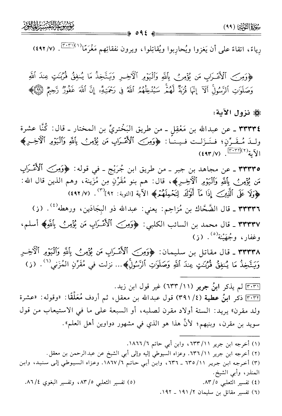 ٣٣٣٣٨ - قال مقاتل بن سليمان: {ومِنَ الأَعْرابِ مَن يُؤْمِنُ بِاللَّهِ واليَوْمِ الآخِرِ ويَتَّخِذُ ما يُنْفِقُ قُرُباتٍ عِنْدَ اللَّهِ وصَلَواتِ الرَّسُولِ} ... نزلت في مُقَرِّنٍ المُزَني (¬٦). (ز)