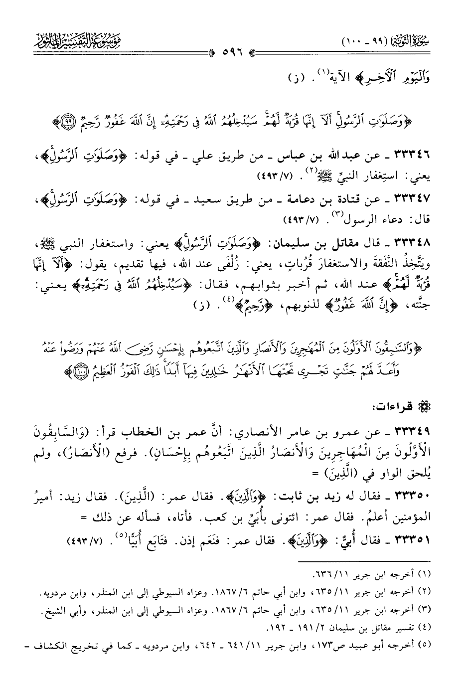 ٣٣٣٤٩ - عن عمرو بن عامر الأنصاري، أنّ عمر بن الخطاب قرأ: (والسّابِقُونَ الأَوَّلُونَ مِنَ المُهاجِرِينَ والأَنصارُ الَّذِينَ اتَّبَعُوهُم بِإحْسانٍ). فرفع (الأَنصارُ)، ولم يُلحق الواو في (الَّذِينَ) =