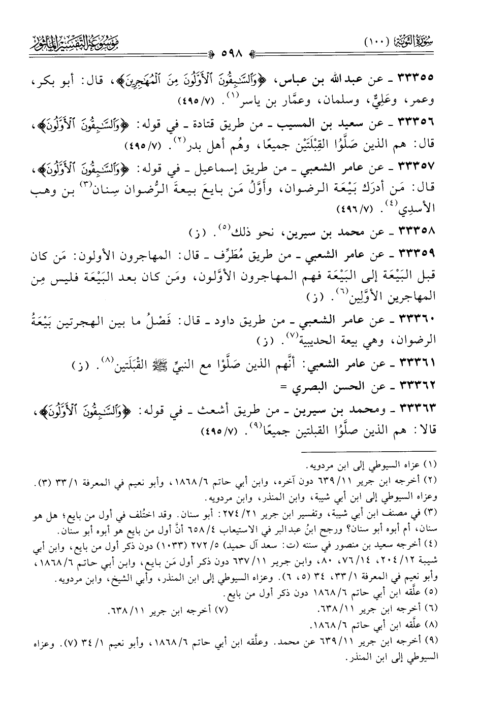٣٣٣٥٦ - عن سعيد بن المسيب -من طريق قتادة- في قوله: {والسابقون الأولون}، قال: هم الذين صَلَّوُا القِبْلَتَيْن جميعًا، وهُم أهل بدر (¬٢). (٧/ ٤٩٥)