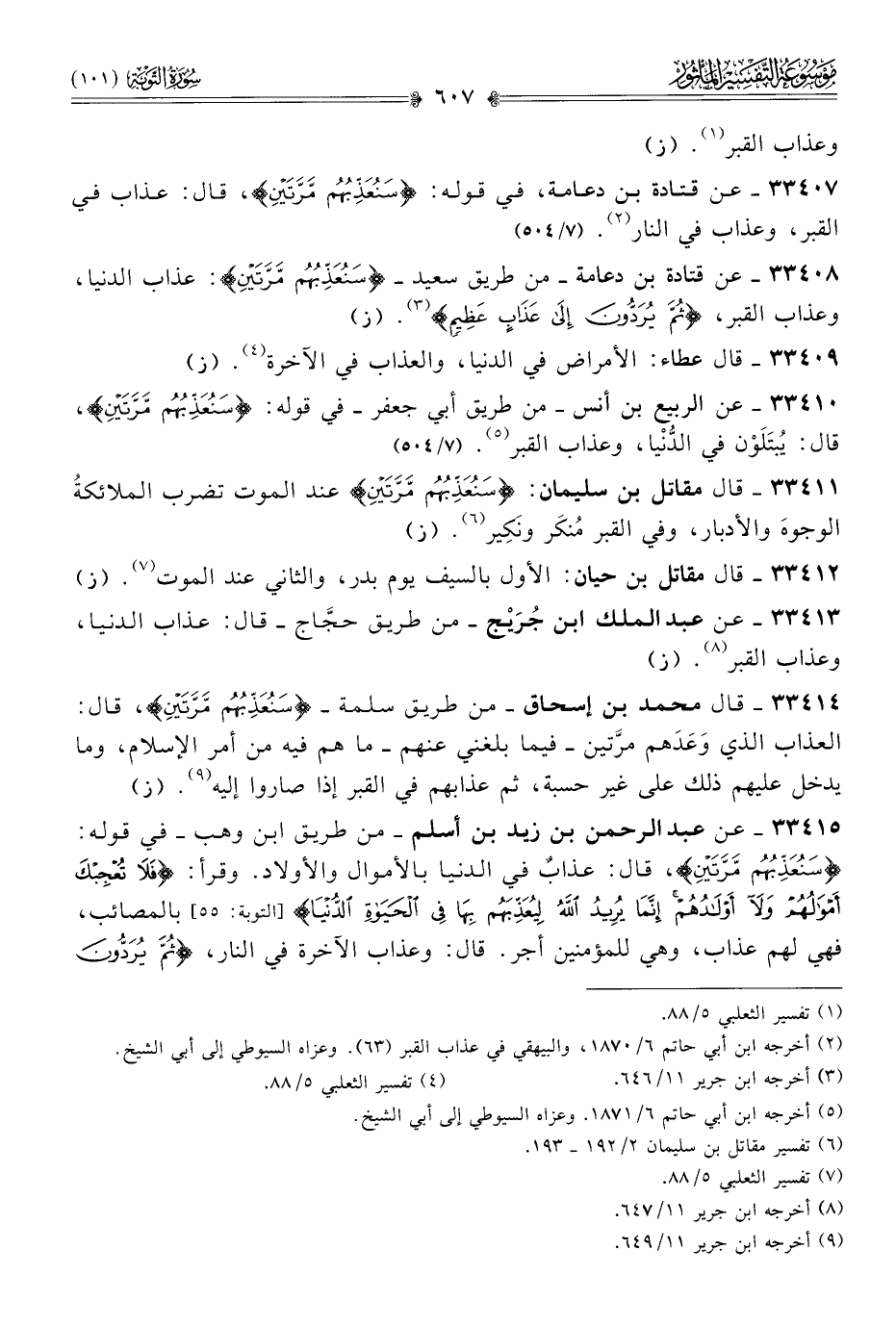 ٣٣٤٠٨ - عن قتادة بن دعامة -من طريق سعيد- {سنعذبهم مرتين}: عذاب الدنيا، وعذاب القبر، {ثم يردون إلى عذاب عظيم} (¬٣). (ز)