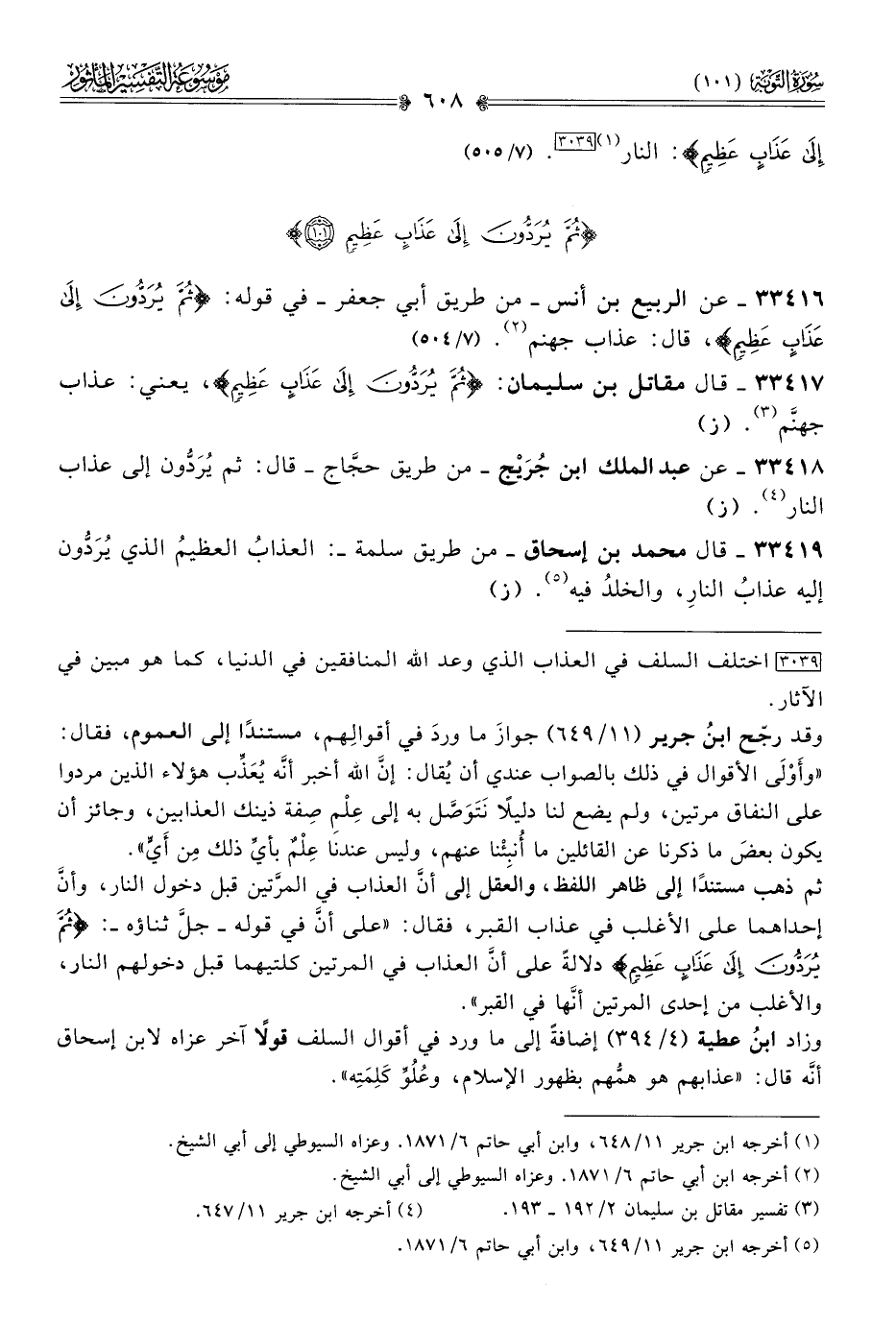 ٣٣٤١٦ - عن الربيع بن أنس -من طريق أبي جعفر- في قوله: {ثم يردون إلى عذاب عظيم}، قال: عذاب جهنم (¬٢). (٧/ ٥٠٤)