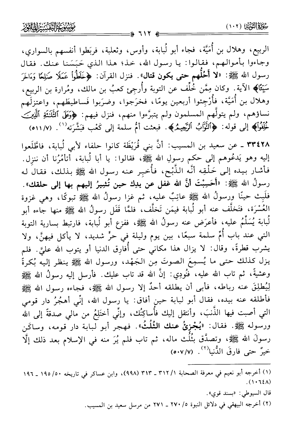 ٣٣٤٢٨ - عن سعيد بن المسيب: أنّ بني قُرَيْظَة كانوا حلفاء لأبي لُبابة، فاطَّلَعوا إليه وهو يَدعُوهم إلى حكم رسولِ الله - صلى الله عليه وسلم -، فقالوا: يا أبا لُبابة، أتأمُرُنا أن ننزِل. فأشار بيده إلى حَلْقِه أنّه الذَّبْح، فأُخبِر عنه رسول الله - صلى الله عليه وسلم - بذلك، فقال له رسولُ الله - صلى الله عليه وسلم -: «أحَسِبْتَ أنّ الله غفل عن يدِك حين تُشِيرُ إليهم بها إلى حلقك». فلَبِث حينًا ورسولُ الله - صلى الله عليه وسلم - عاتِبٌ عليه، ثم غزا رسولُ الله - صلى الله عليه وسلم - تبوكًا، وهي غزوة العُسْرَة، فتَخلَّف عنه أبو لُبابة فيمَن تَخلَّف، فلمّا قَفَل رسولُ الله - صلى الله عليه وسلم - منها جاءه أبو لُبابة يُسَلِّمُ عليه، فأعرَض عنه رسولُ الله - صلى الله عليه وسلم -، ففزع أبو لُبابة، فارتبط بسارية التوبة التي عند باب أُمِّ سلمة سبعًا، بين يوم وليلة في حرٍّ شديد، لا يأكل فيهنَّ، ولا يشرب قطرةً، وقال: لا يزال هذا مكاني حتى أُفارِق الدنيا أو يتوب الله عليَّ. فلم يزل كذلك حتى ما يُسمِعَ الصوتَ مِن الجَهْد، ورسول الله - صلى الله عليه وسلم - ينظر إليه بُكرةً وعشيةً، ثم تاب الله عليه، فنُودِي: إنّ الله قد تاب عليك. فأرسل إليه رسولُ الله - صلى الله عليه وسلم - لِيُطلِقَ عنه رباطه، فأبى أن يطلقه أحدٌ إلا رسول الله - صلى الله عليه وسلم -، فجاءه رسول الله - صلى الله عليه وسلم - فأطلقه عنه بيده، فقال أبو لبابة حين أفاق: يا رسول الله، إنِّي أهجُرُ دار قومي التي أصبت فيها الذَّنبَ، وأنتقل إليك فأُساكِنُك، وإنِّي أختَلِعُ من مالي صدقةً إلى الله ورسوله - صلى الله عليه وسلم -. فقال: «يُجْزِئُ عنك الثُلُثُ». فهجر أبو لبابة دار قومه، وساكَن رسولَ الله - صلى الله عليه وسلم -، وتصدَّق بثُلُث ماله، ثم تاب فلم يُرَ منه في الإسلام بعد ذلك إلّا خيرٌ حتى فارقَ الدُّنيا (¬٢). (٧/ ٥٠٧)