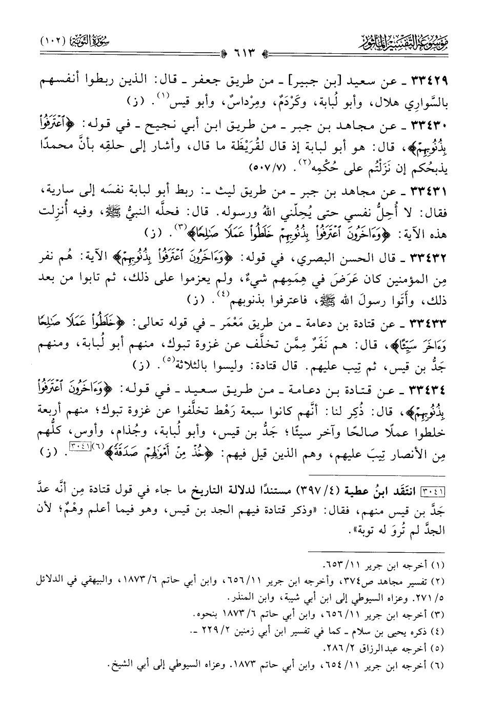 ٣٣٤٣٤ - عن قتادة بن دعامة -من طريق سعيد- في قوله: {وءاخرون اعترفوا بذنوبهم}، قال: ذُكِر لنا: أنّهم كانوا سبعة رَهْط تخلَّفوا عن غزوة تبوك؛ منهم أربعة خلطوا عملًا صالحًا وآخر سيئًا؛ جَدُّ بن قيس، وأبو لُبابة، وجُذام، وأوس، كلُّهم مِن الأنصار تِيبَ عليهم، وهم الذين قيل فيهم: {خذ من أموالهم صدقة} (¬٦) [٣٠٤١]. (ز)