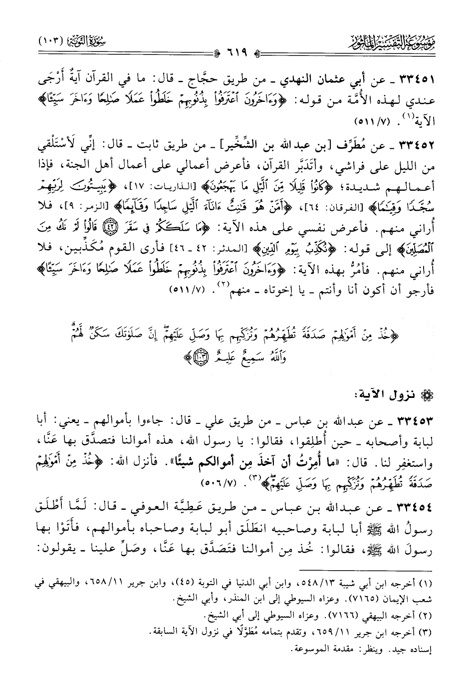 ٣٣٤٥٣ - عن عبد الله بن عباس -من طريق علي- قال: جاءوا بأموالهم -يعني: أبا لبابة وأصحابه- حين أُطلِقوا، فقالوا: يا رسول الله، هذه أموالنا فتصدَّق بها عَنّا، واستغفِر لنا. قال: «ما أُمِرْتُ أن آخذَ مِن أموالكم شيئًا». فأنزل الله: {خذ من أموالهم صدقة تطهرهم وتزكيهم بها وصل عليهم} (¬٣). (٧/ ٥٠٦)