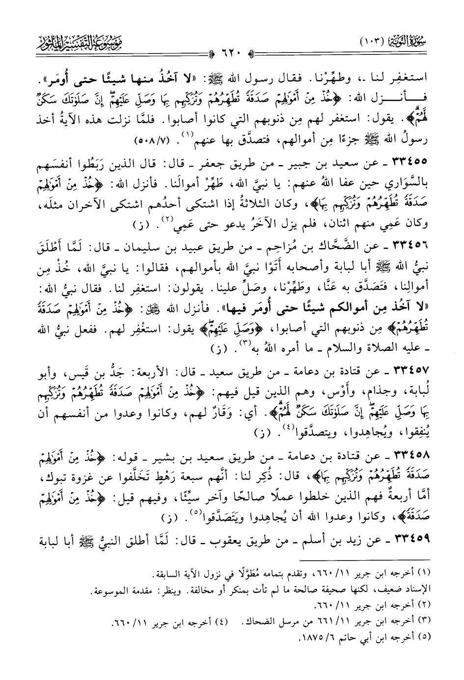 ٣٣٤٥٨ - عن قتادة بن دعامة -من طريق سعيد بن بشير- قوله: {خذ من أموالهم صدقة تطهرهم وتزكيهم بها}، قال: ذُكِر لنا: أنّهم سبعة رَهْطٍ تَخَلَّفوا عن غزوة تبوك، أمّا أربعةٌ فهم الذين خلطوا عملًا صالحًا وآخر سيِّئًا، وفيهم قيل: {خذ من أموالهم صدقة}، وكانوا وعدوا الله أن يُجاهِدوا ويَتَصَدَّقوا (¬٥). (ز)