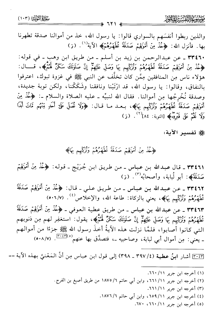 ٣٣٤٦٣ - عن عبد الله بن عباس -من طريق عطية العوفي- {خذ من أموالهم صدقة تطهرهم وتزكيهم بها وصل عليهم إن صلاتك سكن لهم}، يقول: استغفِر لهم مِن ذنوبهم التي كانوا أصابوا، فلمّا نزلت هذه الآيةُ أخذَ رسول الله - صلى الله عليه وسلم - جزءًا من أموالهم -يعني: مِن أموال أبي لبابة، وصاحبيه-، فتصدَّق بها عنهم (¬٥) [٣٠٤٣]. (٧/ ٥٠٨)