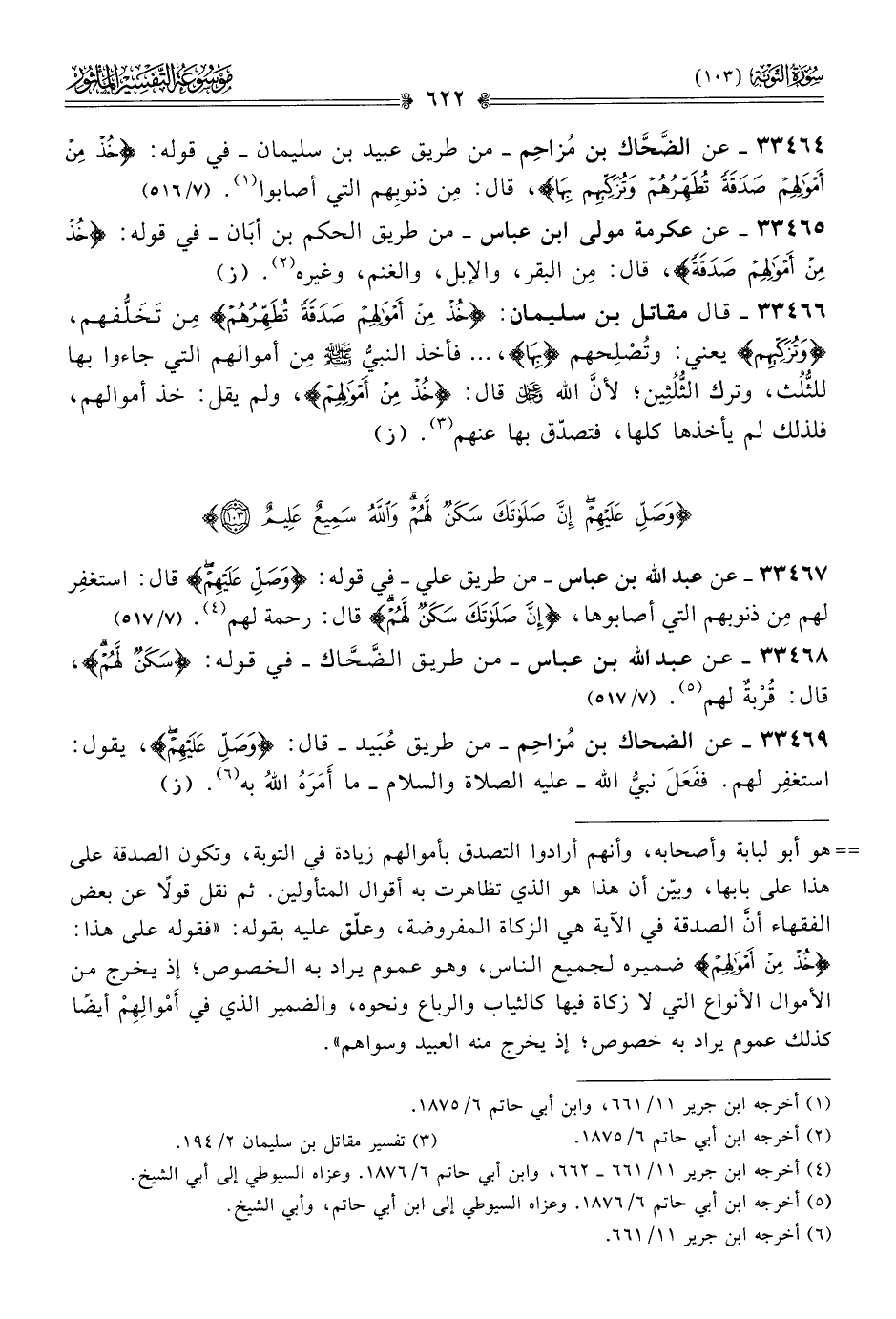 ٣٣٤٦٤ - عن الضَّحّاك بن مُزاحِم -من طريق عبيد بن سليمان- في قوله: {خُذ مِن أموالهم صدقة تُطَهِرُهُم وتُزَكِيهِم بِها}، قال: مِن ذنوبِهم التي أصابوا (¬١). (٧/ ٥١٦)