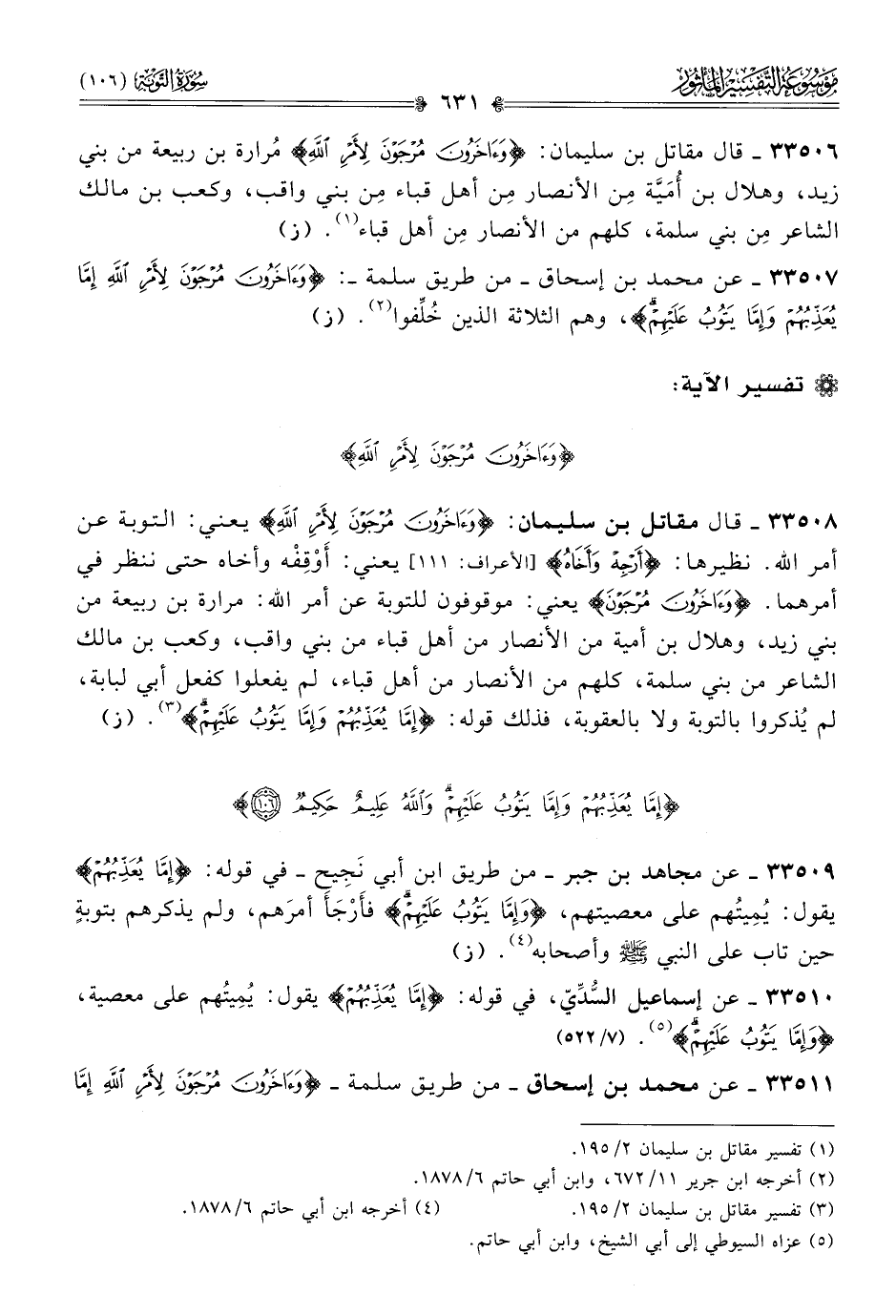 ٣٣٥٠٧ - عن محمد بن إسحاق -من طريق سلمة-: {وآخرون مرجون لأمر الله إما يعذبهم وإما يتوب عليهم}، وهم الثلاثة الذين خُلِّفوا (¬٢). (ز)