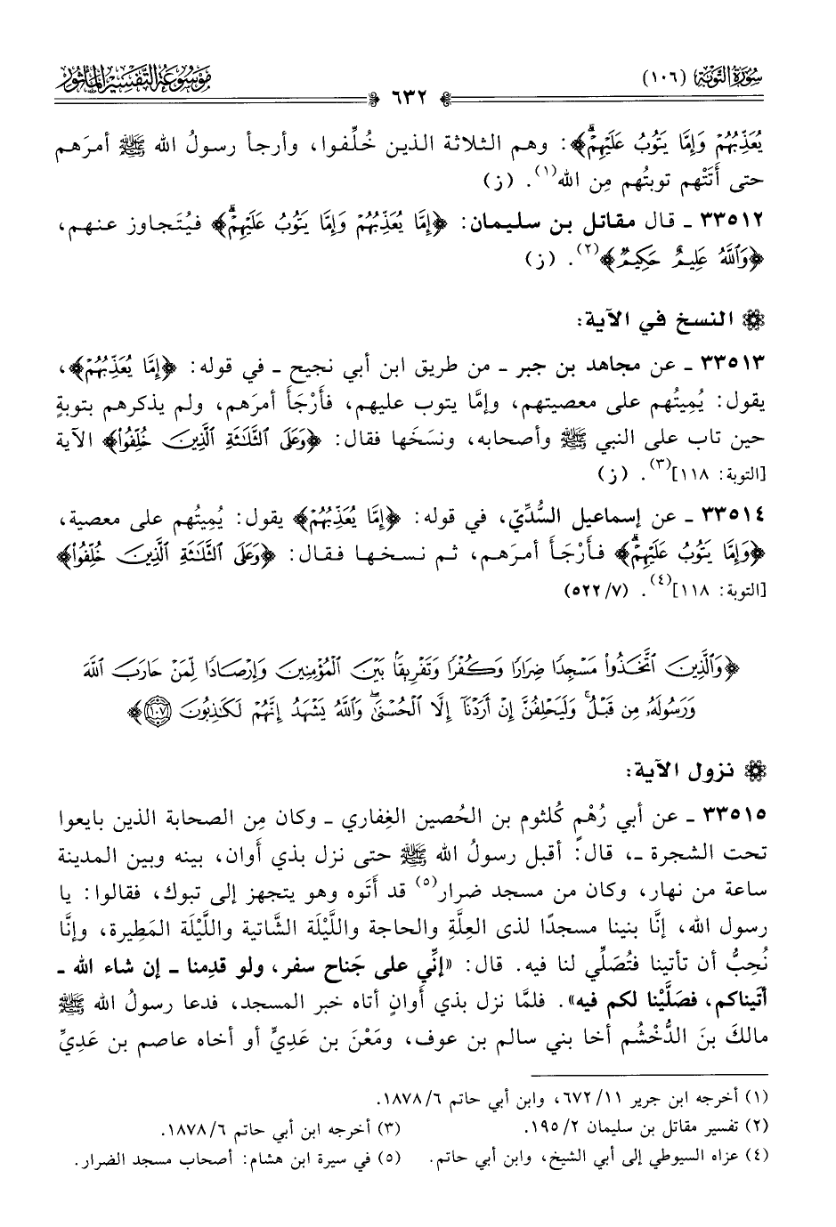٣٣٥١٣ - عن مجاهد بن جبر -من طريق ابن أبي نجيح- في قوله: {إما يعذبهم}، يقول: يُمِيتُهم على معصيتهم، وإمّا يتوب عليهم، فأَرْجَأَ أمرَهم، ولم يذكرهم بتوبةٍ حين تاب على النبي - صلى الله عليه وسلم - وأصحابه، ونسَخَها فقال: {وعلى الثلاثة الذين خلفوا} الآية [التوبة: ١١٨] (¬٣). (ز)