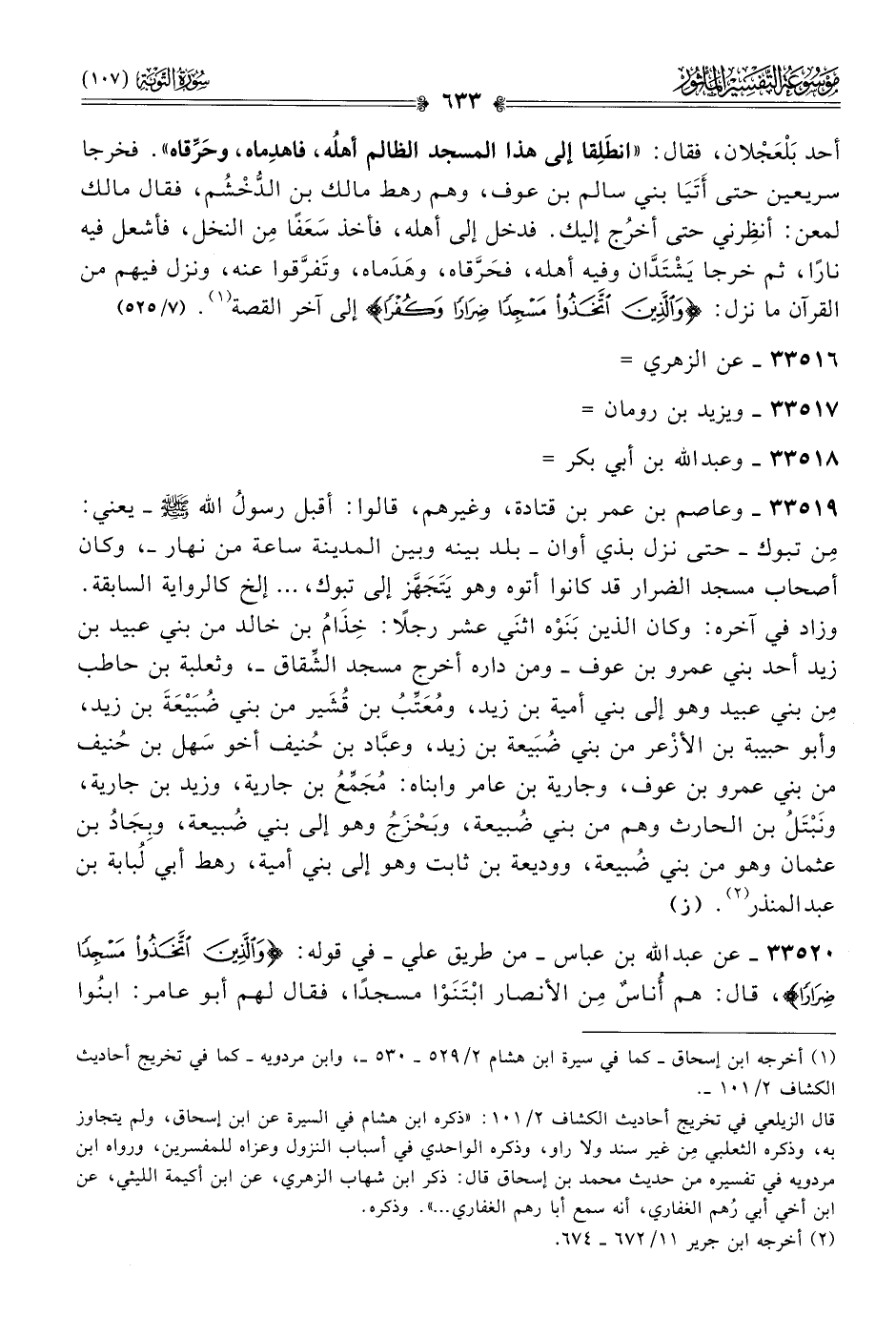 ٣٣٥٢٠ - عن عبد الله بن عباس -من طريق علي- في قوله: {والذين اتخذوا مسجدًا ضرارًا}، قال: هم أُناسٌ مِن الأنصار ابْتَنَوْا مسجدًا، فقال لهم أبو عامر: ابنُوا