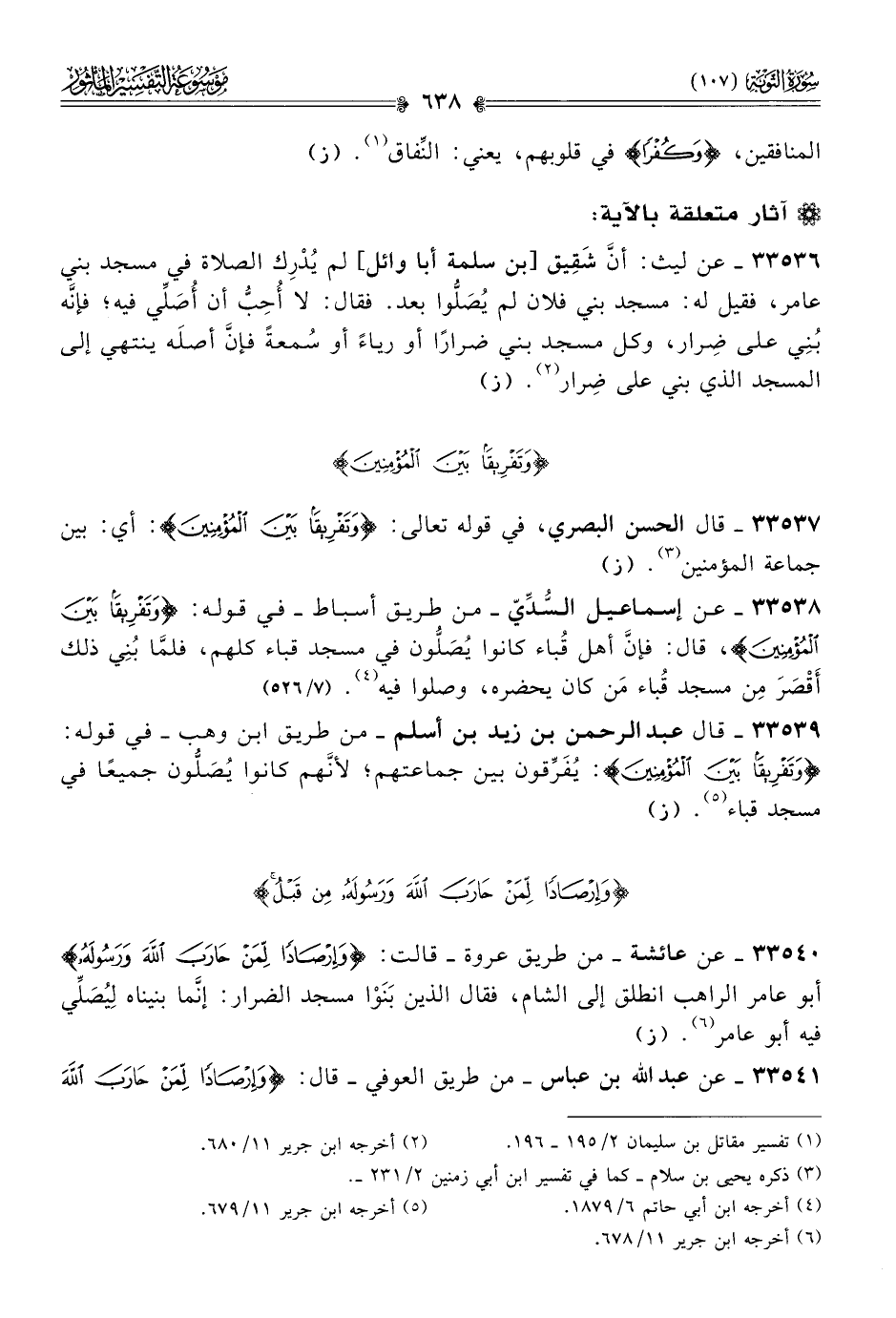 ٣٣٥٣٩ - قال عبد الرحمن بن زيد بن أسلم -من طريق ابن وهب- في قوله: {وتفريقا بين المؤمنين}: يُفَرِّقون بين جماعتهم؛ لأنّهم كانوا يُصَلُّون جميعًا في مسجد قباء (¬٥). (ز)