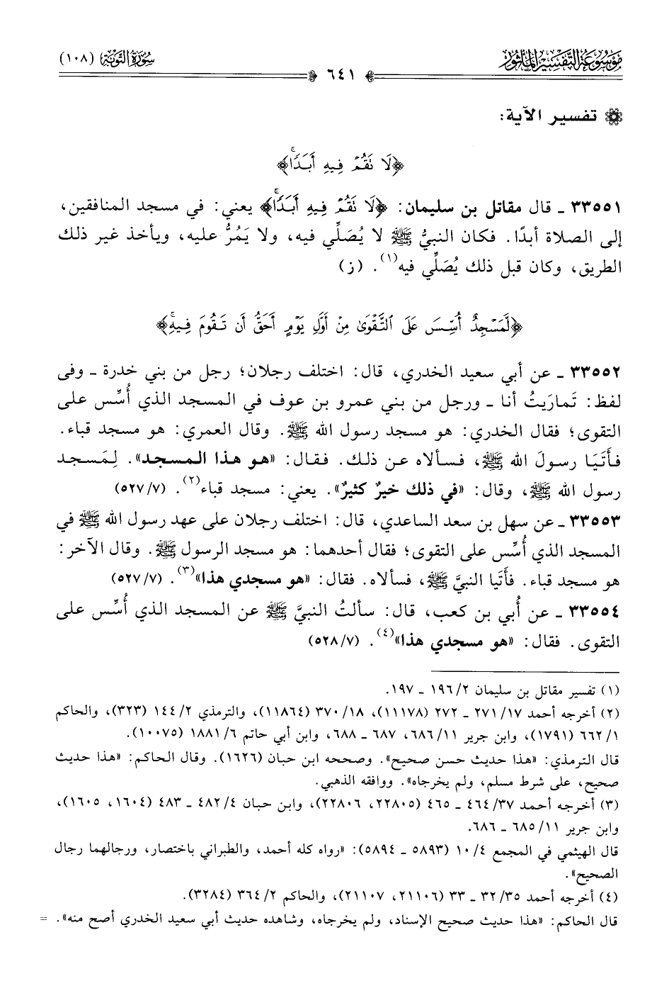 ٣٣٥٥١ - قال مقاتل بن سليمان: {لا تَقُمْ فِيهِ أبَدًا} يعني: في مسجد المنافقين، إلى الصلاة أبدًا. فكان النبيُّ - صلى الله عليه وسلم - لا يُصَلِّي فيه، ولا يَمُرُّ عليه، ويأخذ غير ذلك الطريق، وكان قبل ذلك يُصَلِّي فيه (¬١). (ز)