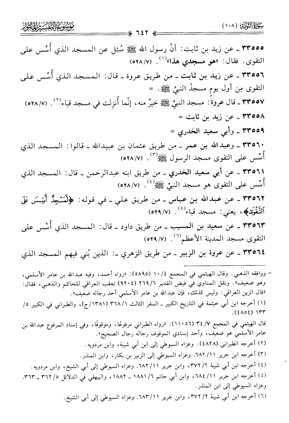 ٣٣٥٦١ - عن أبي سعيد الخدري -من طريق ابنه عبد الرحمن- قال: المسجد الذي أُسِّس على التقوى هو مسجد النبيِّ - صلى الله عليه وسلم - (¬٤). (٧/ ٥٢٨)