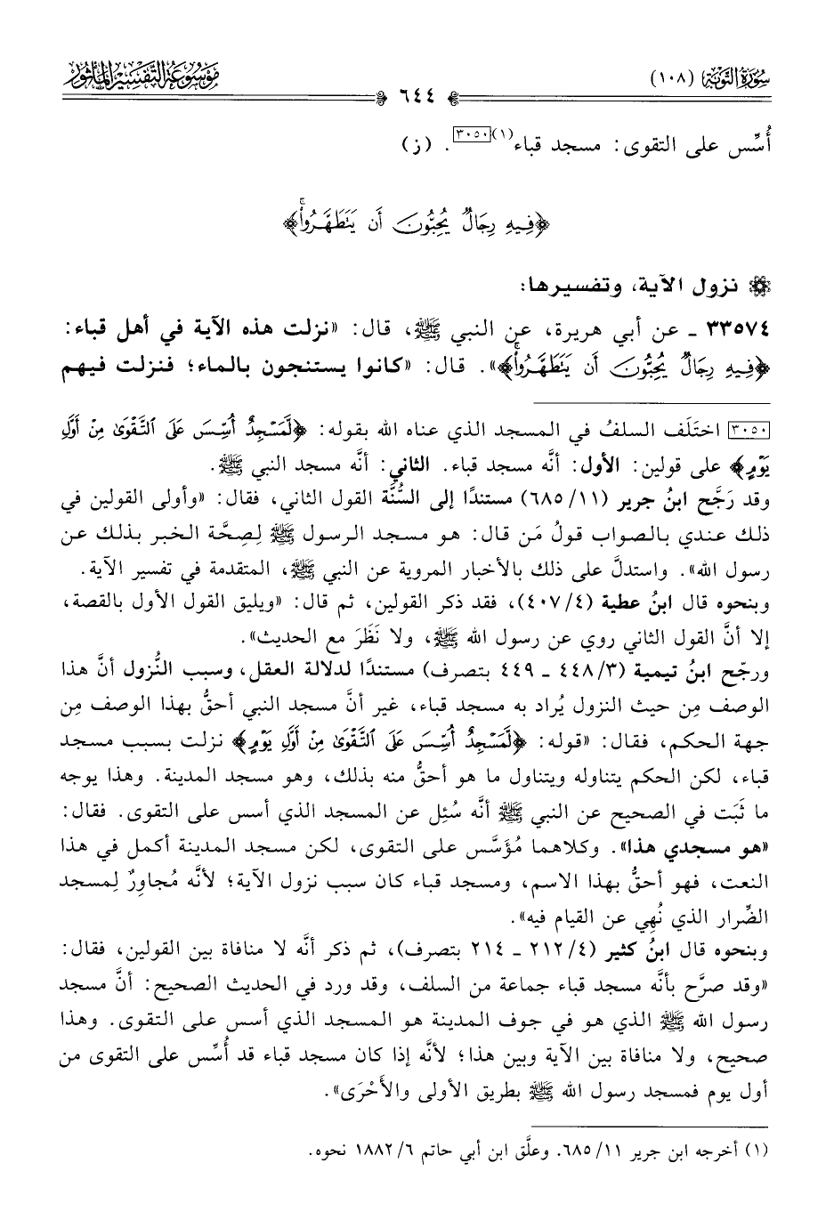 [٣٠٥٠] اختَلَف السلفُ في المسجد الذي عناه الله بقوله: {لمسجد أسس على التقوى من أول يوم} على قولين: الأول: أنّه مسجد قباء. الثاني: أنّه مسجد النبي - صلى الله عليه وسلم -.