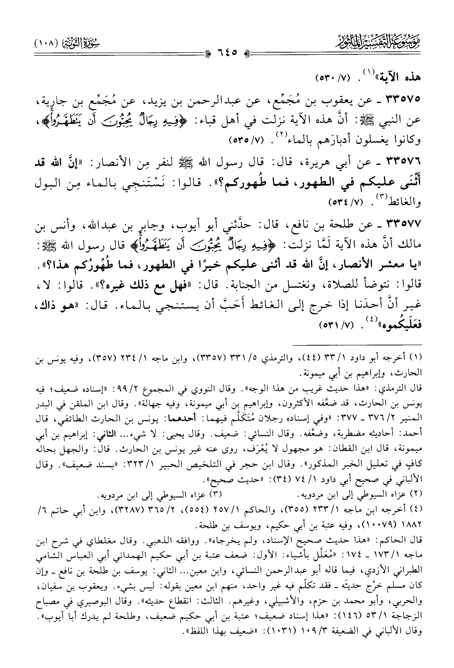 ٣٣٥٧٥ - عن يعقوب بن مُجَمِّع، عن عبد الرحمن بن يزيد، عن مُجَمِّع بن جارية، عن النبي - صلى الله عليه وسلم -: أنّ هذه الآية نزلت في أهل قباء: {فيه رجال يحبون أن يتطهروا}، وكانوا يغسلون أدبارَهم بالماء (¬٢). (٧/ ٥٣٥)