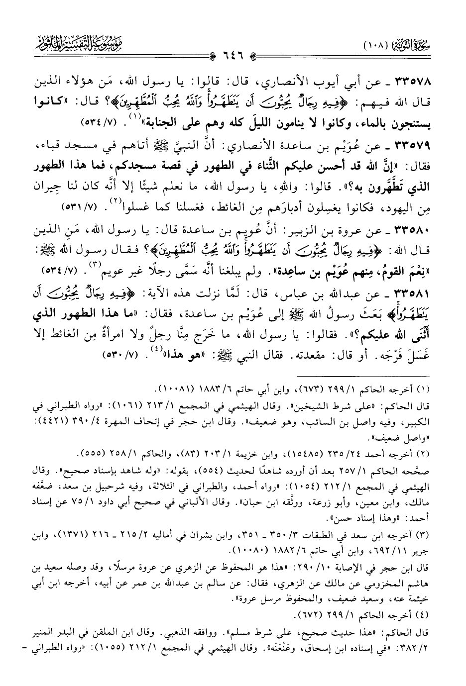 ٣٣٥٨١ - عن عبد الله بن عباس، قال: لَمّا نزلت هذه الآية: {فيه رجال يحبون أن يتطهروا} بَعَثَ رسولُ الله - صلى الله عليه وسلم - إلى عُوَيْم بن ساعدة، فقال: «ما هذا الطهور الذي أثْنى الله عليكم؟». فقالوا: يا رسول الله، ما خَرَج مِنّا رجلٌ ولا امرأةٌ مِن الغائط إلا غَسَلَ فَرْجَه. أو قال: مقعدته. فقال النبي - صلى الله عليه وسلم -: «هو هذا» (¬٤). (٧/ ٥٣٠)
