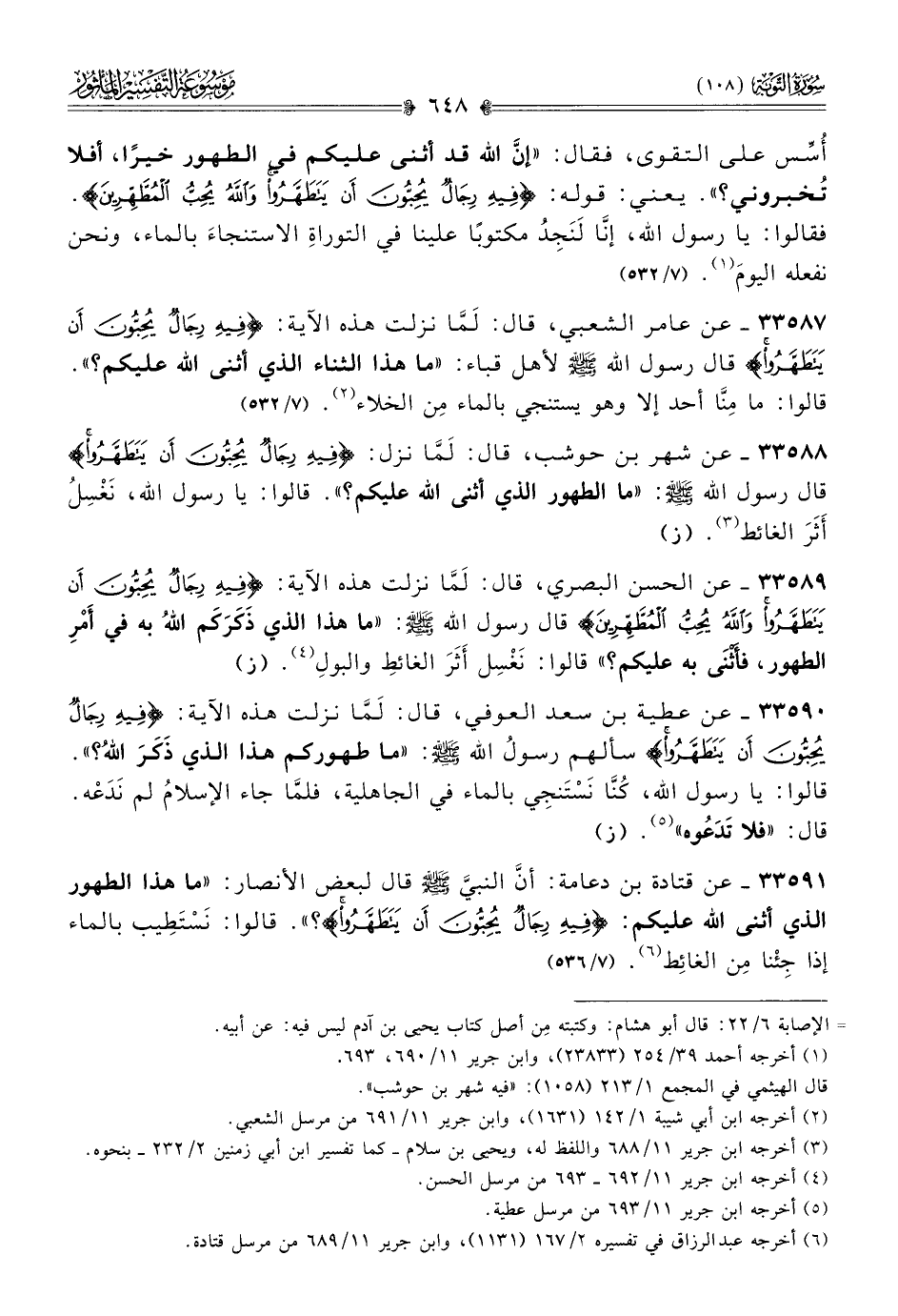 ٣٣٥٨٧ - عن عامر الشعبي، قال: لَمّا نزلت هذه الآية: {فيه رجال يحبون أن يتطهروا} قال رسول الله - صلى الله عليه وسلم - لأهل قباء: «ما هذا الثناء الذي أثنى الله عليكم؟». قالوا: ما مِنّا أحد إلا وهو يستنجي بالماء مِن الخلاء (¬٢). (٧/ ٥٣٢)