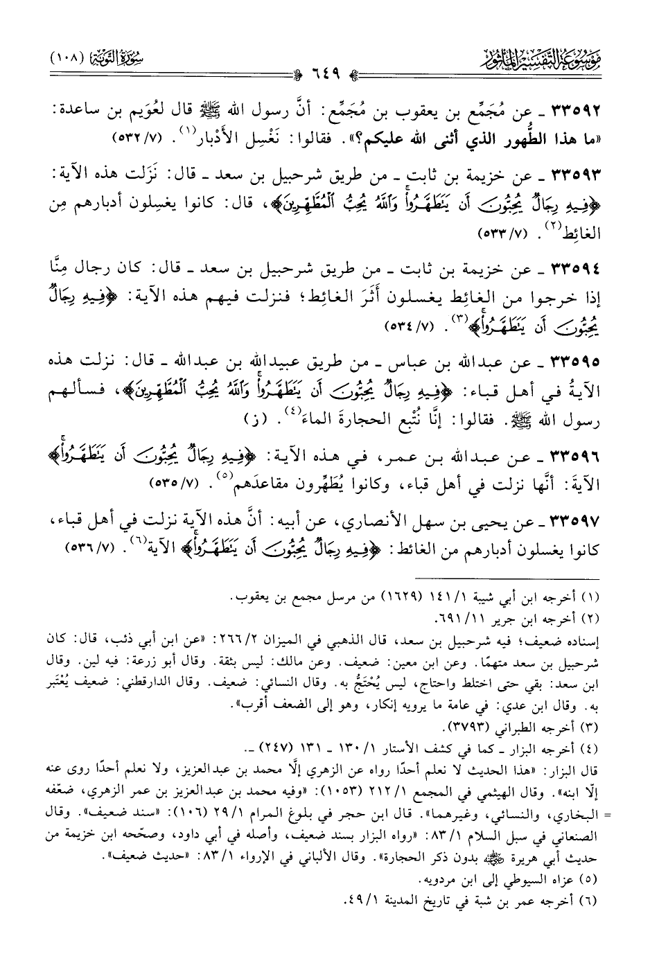 ٣٣٥٩٤ - عن خزيمة بن ثابت -من طريق شرحبيل بن سعد- قال: كان رجال مِنّا إذا خرجوا من الغائِط يغسلون أثَرَ الغائِط؛ فنزلت فيهم هذه الآية: {فيه رجال يحبون أن يتطهروا} (¬٣). (٧/ ٥٣٤)