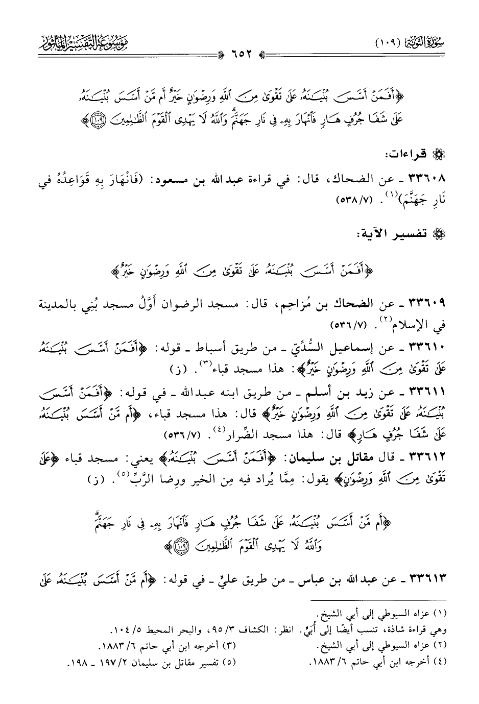٣٣٦١١ - عن زيد بن أسلم -من طريق ابنه عبد الله- في قوله: {أفمن أسس بنيانه على تقوى من الله ورضوان خير} قال: هذا مسجد قباء، {أم مَّن أسس بنيانه على شفا جرف هار} قال: هذا مسجد الضِّرار (¬٤). (٧/ ٥٣٦)