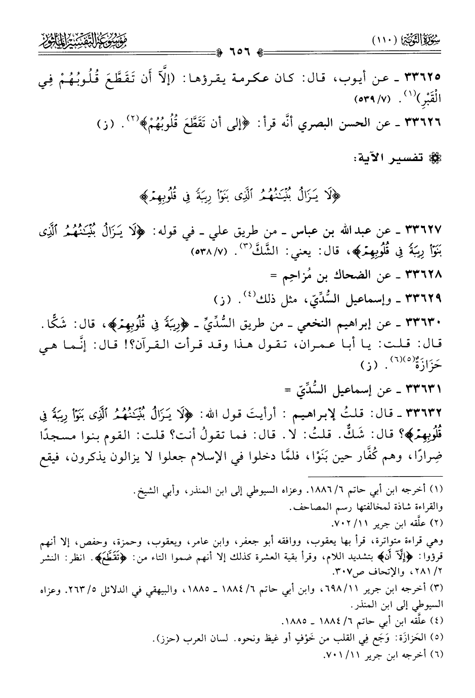 ٣٣٦٣٢ - قال: قلتُ لإبراهيم: أرأيتَ قول الله: {لا يزال بنيانهم الذي بنوا ريبة في قلوبهم}؟ قال: شَكٌّ. قلتُ: لا. قال: فما تقولُ أنت؟ قلت: القوم بنوا مسجدًا ضِرارًا، وهم كُفّار حين بَنَوْا، فلمّا دخلوا في الإسلام جعلوا لا يزالون يذكرون، فيقع