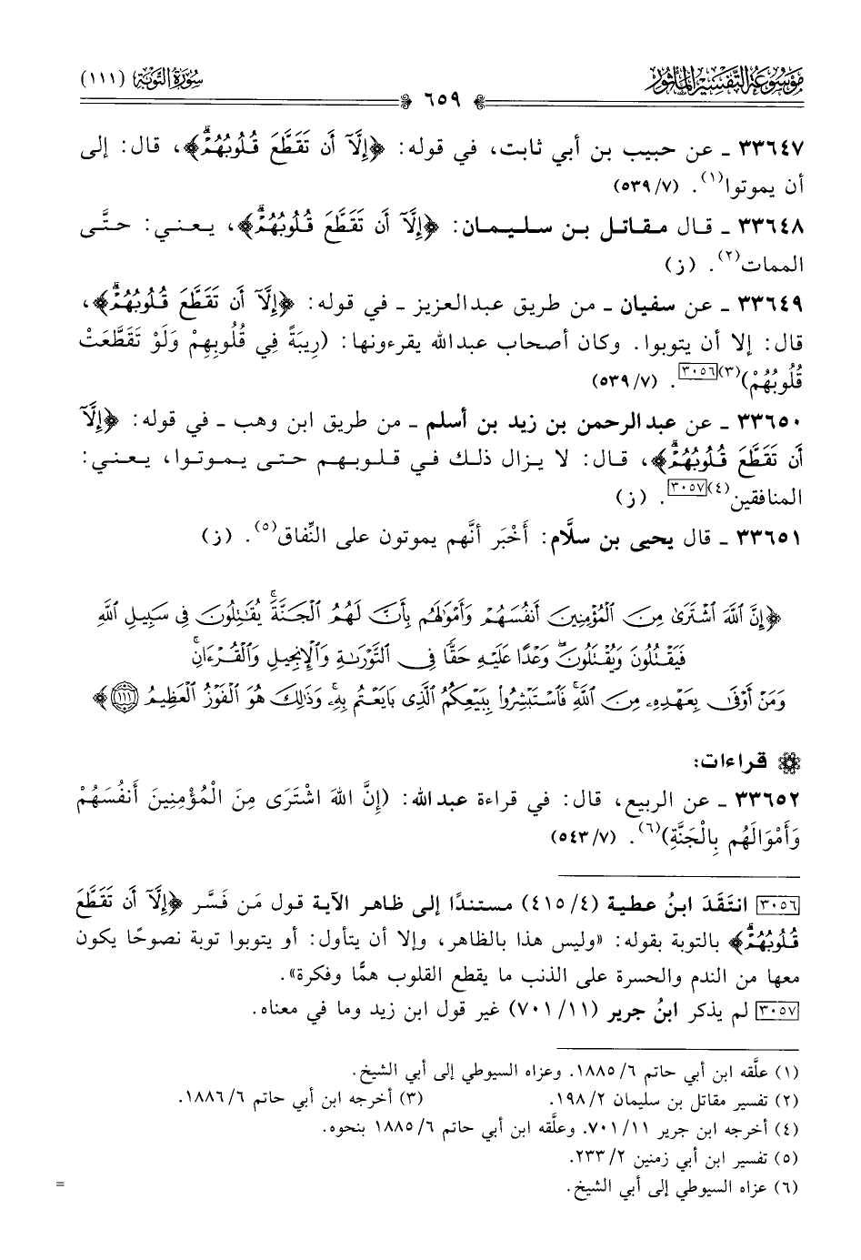 ٣٣٦٥٠ - عن عبد الرحمن بن زيد بن أسلم -من طريق ابن وهب- في قوله: {إلا أن تقطع قلوبهم}، قال: لا يزال ذلك في قلوبهم حتى يموتوا، يعني: المنافقين (¬٤) [٣٠٥٧]. (ز)