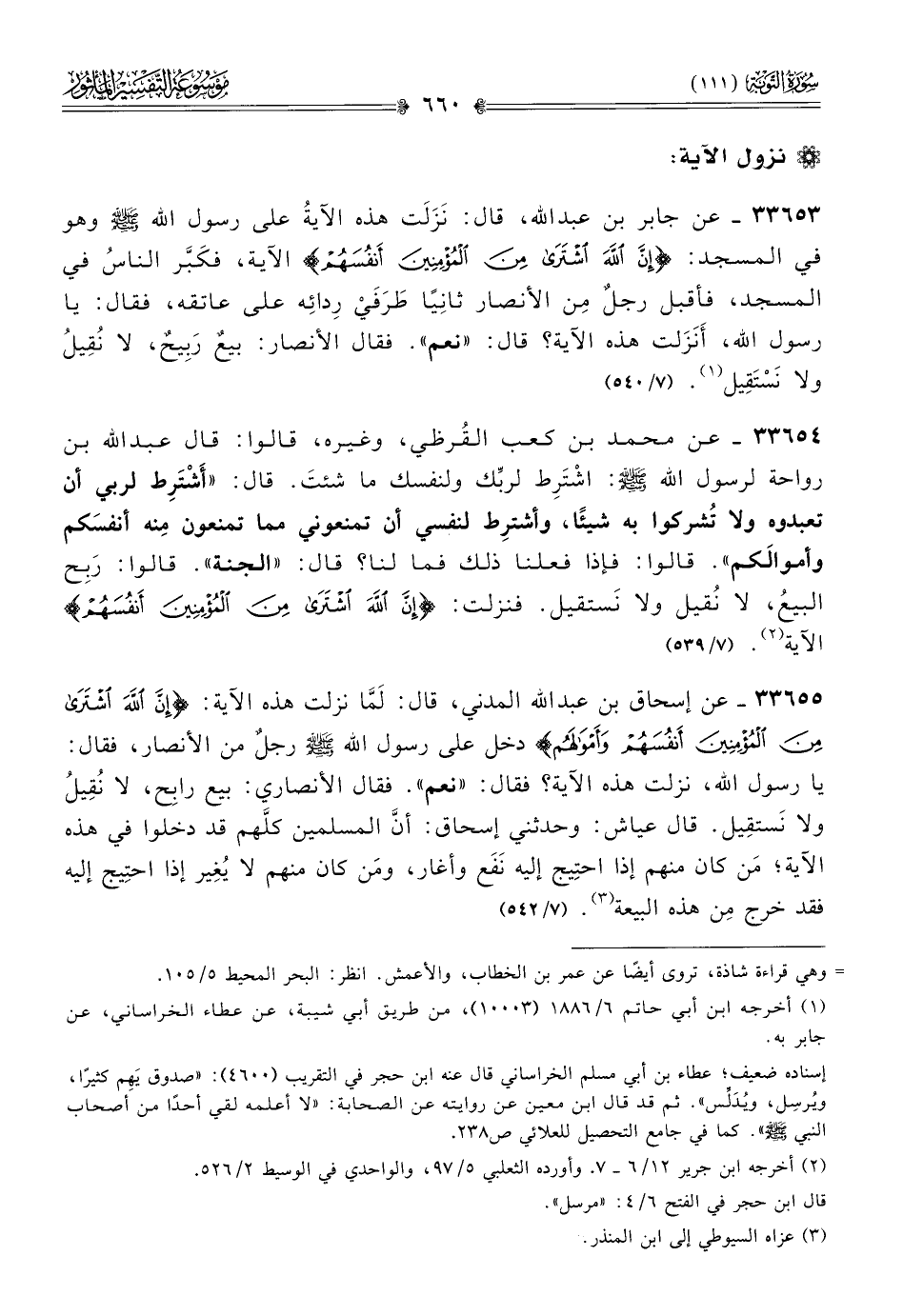 ٣٣٦٥٣ - عن جابر بن عبد الله، قال: نَزَلَت هذه الآيةُ على رسول الله - صلى الله عليه وسلم - وهو في المسجد: {إن الله اشترى من المؤمنين أنفسهم} الآية، فكَبَّر الناسُ في المسجد، فأقبل رجلٌ مِن الأنصار ثانِيًا طَرَفَيْ رِدائِه على عاتقه، فقال: يا رسول الله، أنَزَلت هذه الآية؟ قال: «نعم». فقال الأنصار: بيعٌ رَبِيحٌ، لا نُقِيلُ ولا نَسْتَقِيل (¬١). (٧/ ٥٤٠)