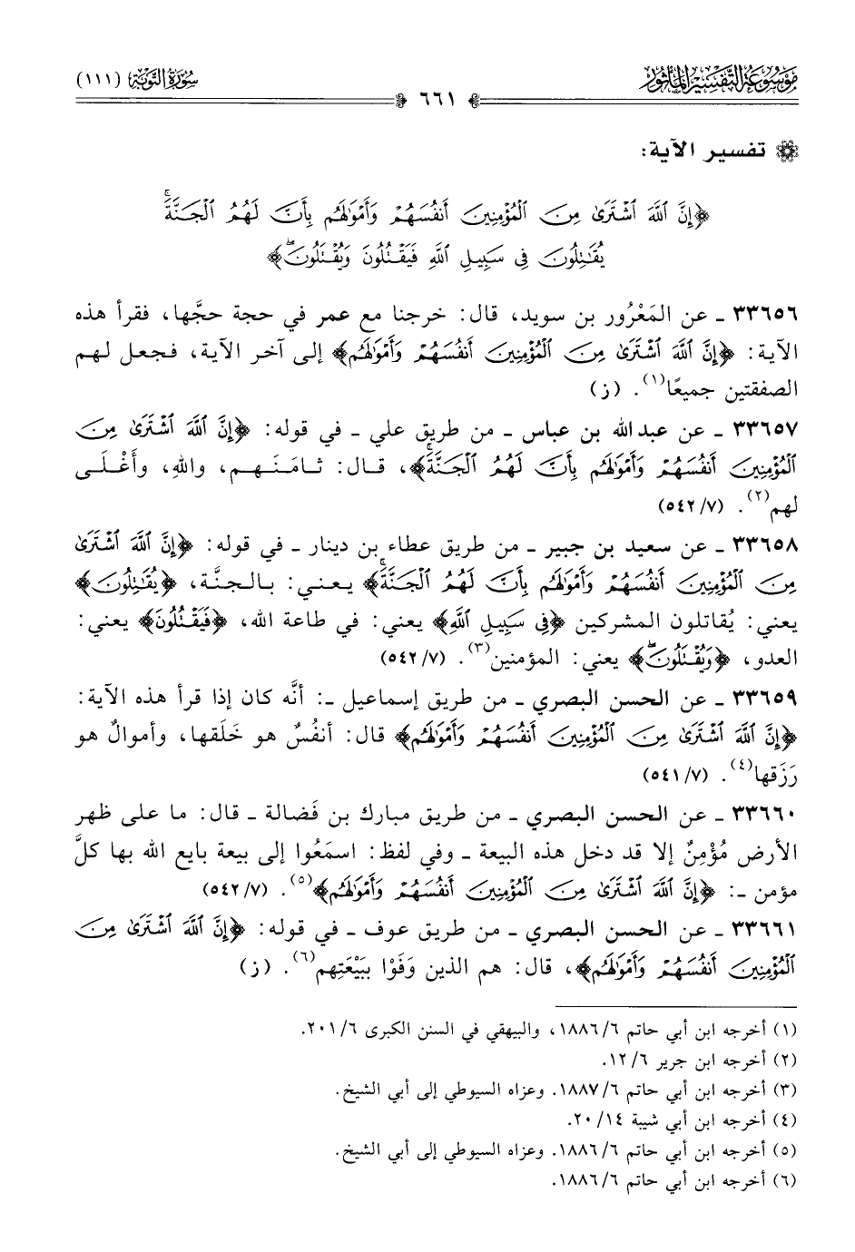 ٣٣٦٥٦ - عن المَعْرُور بن سويد، قال: خرجنا مع عمر في حجة حجَّها، فقرأ هذه الآية: {إن الله اشترى من المؤمنين أنفسهم وأموالهم} إلى آخر الآية، فجعل لهم الصفقتين جميعًا (¬١). (ز)