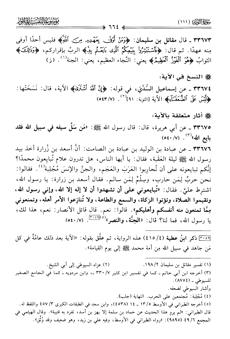 ٣٣٦٧٤ - عن إسماعيل السُّدِّيّ، في قوله: {إن الله اشترى} الآية، قال: نَسَخَتْها: {ليس على الضعفاء} الآية [التوبة: ٩١] (¬٢). (٧/ ٥٤٣)
