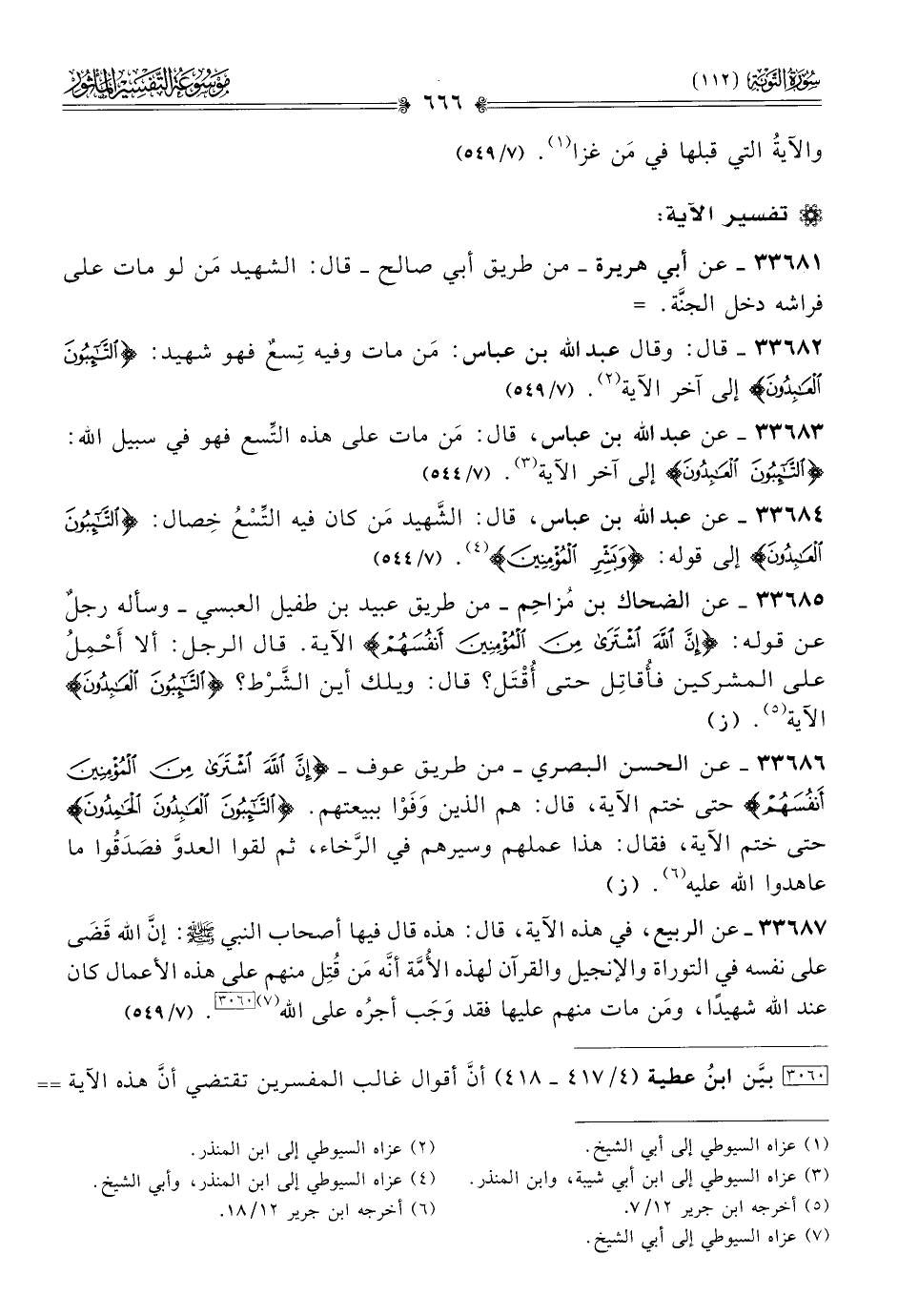 ٣٣٦٨٢ - قال: وقال عبد الله بن عباس: مَن مات وفيه تِسعٌ فهو شهيد: {التائبون العابدون} إلى آخر الآية (¬٢). (٧/ ٥٤٩)