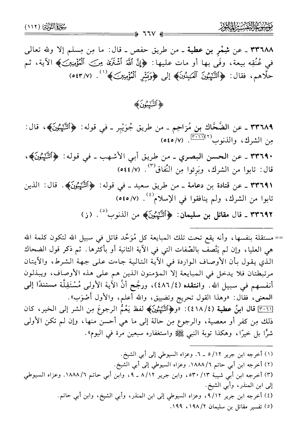٣٣٦٨٩ - عن الضَّحّاك بن مُزاحِم -من طريق جُوَيْبِر- في قوله: {التائبون}، قال: مِن الشرك، والذنوب (¬٢) [٣٠٦١].