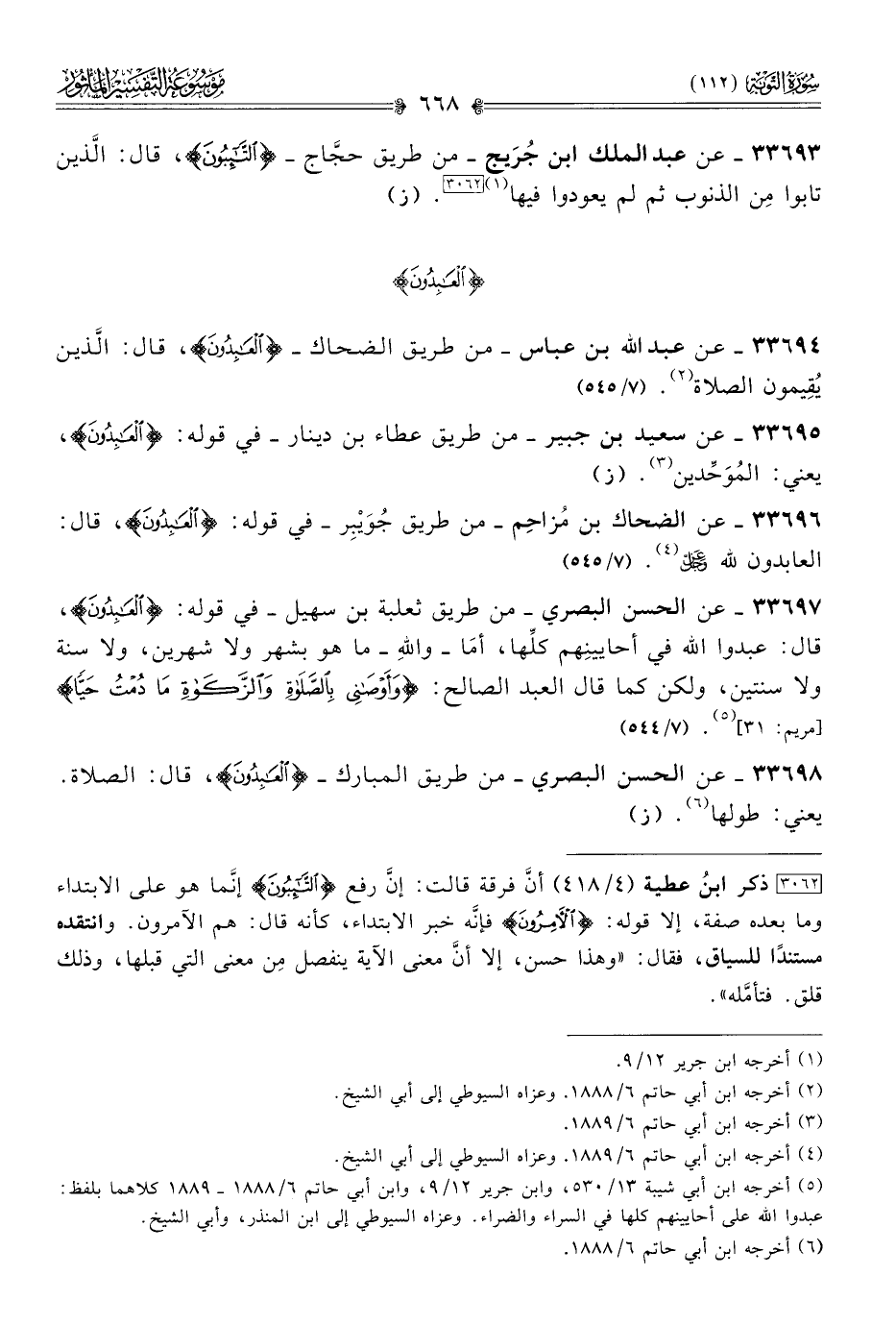 ٣٣٦٩٦ - عن الضحاك بن مُزاحِم -من طريق جُوَيْبِر- في قوله: {العابدون}، قال: العابدون لله - عز وجل - (¬٤). (٧/ ٥٤٥)