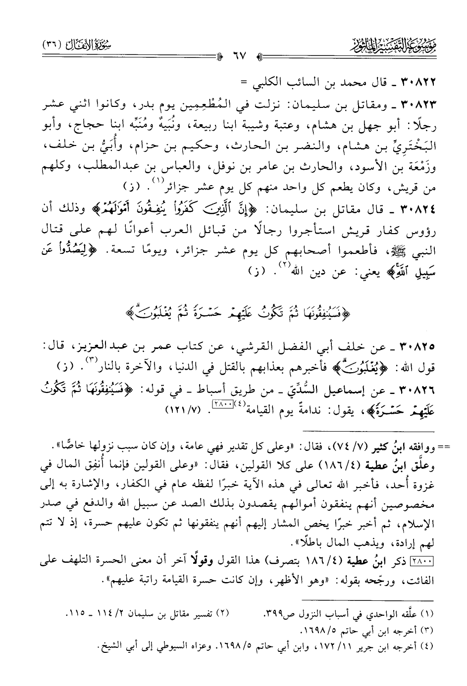 ٣٠٨٢٦ - عن إسماعيل السُّدِّيّ -من طريق أسباط- في قوله: {فسينفقونها ثم تكون عليهم حسرة}، يقول: ندامةً يوم القيامة (¬٤) [٢٨٠٠]. (٧/ ١٢١)