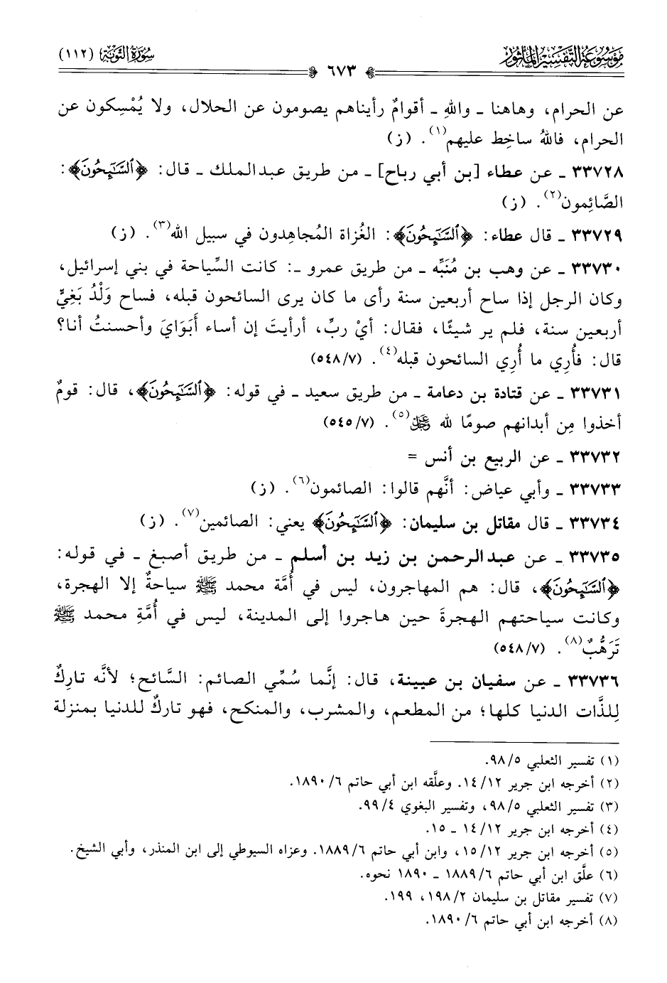 ٣٣٧٢٩ - قال عطاء: {السائحون}: الغُزاة المُجاهِدون في سبيل الله (¬٣). (ز)