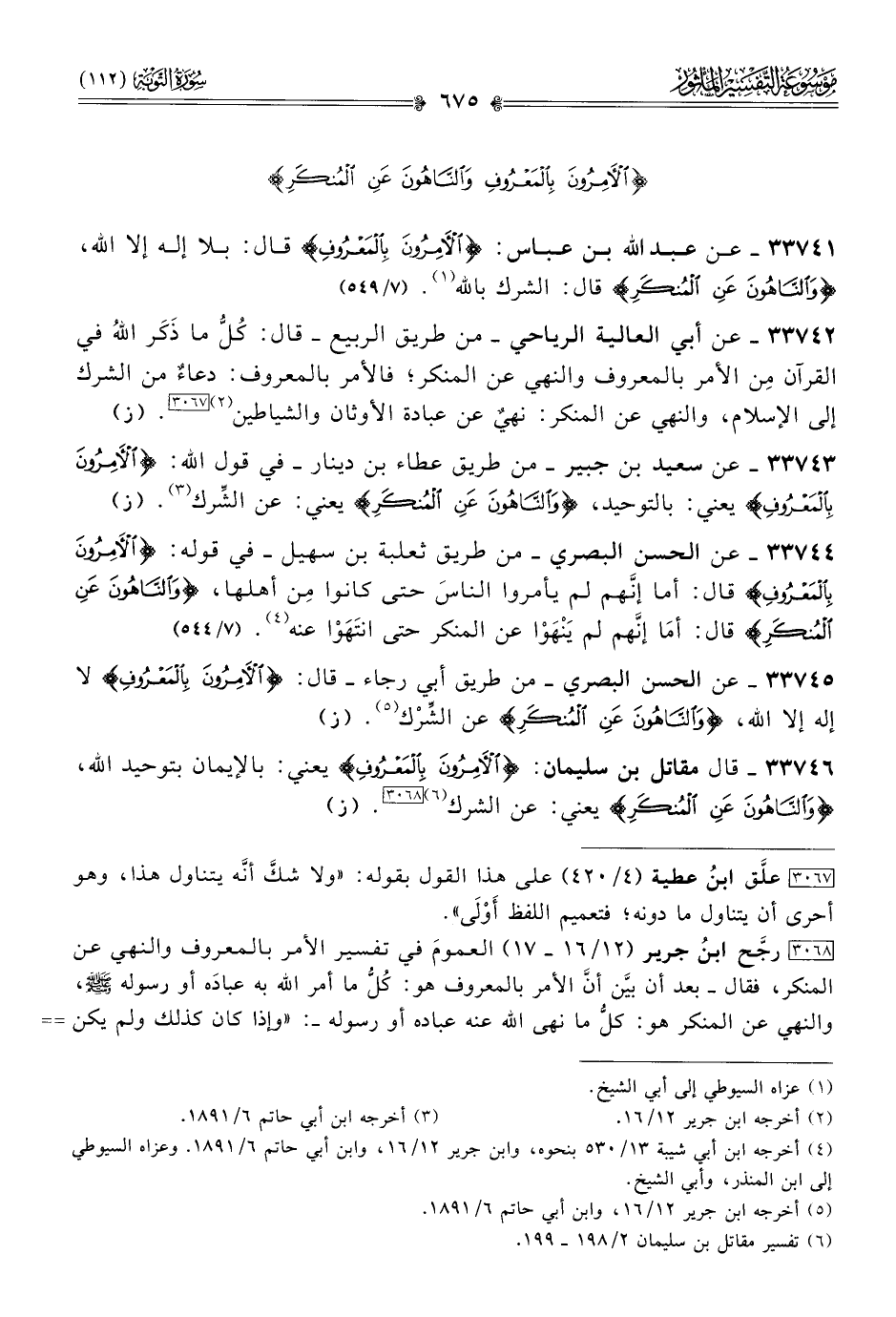 ٣٣٧٤١ - عن عبد الله بن عباس: {الآمرون بالمعروف} قال: بلا إله إلا الله، {والناهون عن المنكر} قال: الشرك بالله (¬١).