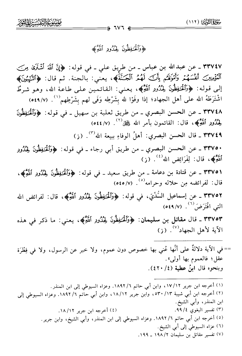 ٣٣٧٤٧ - عن عبد الله بن عباس -من طريق علي- في قوله: {إن الله اشترى من المؤمنين أنفسهم وأموالهم بأن لهم الجنة}، يعني: بالجنة. ثم قال: {التائبون} إلى قوله: {والحافظون لحدود الله}، يعني: القائمين على طاعة الله، وهو شرطٌ اشْتَرَطَهُ الله على أهل الجهاد؛ إذا وفَوْا لله بِشَرْطِه وفى لهم بِشَرْطِهم (¬١). (٧/ ٥٤٩)