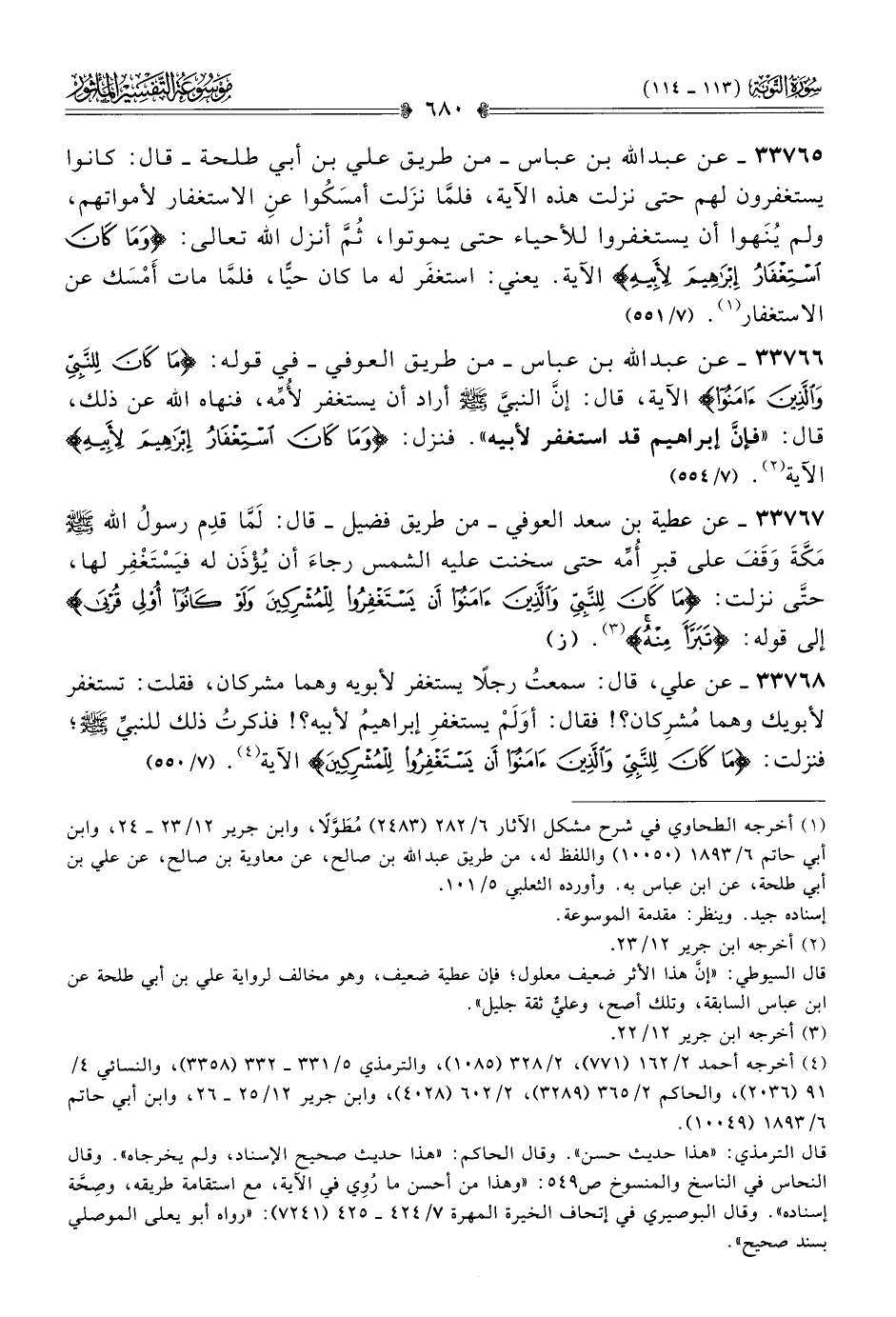 ٣٣٧٦٦ - عن عبد الله بن عباس -من طريق العوفي- في قوله: {ما كان للنبى والذين آمنوا} الآية، قال: إنّ النبيَّ - صلى الله عليه وسلم - أراد أن يستغفر لأُمِّه، فنهاه الله عن ذلك، قال: «فإنّ إبراهيم قد استغفر لأبيه». فنزل: {وما كان استغفار إبراهيم لأبيه} الآية (¬٢). (٧/ ٥٥٤)