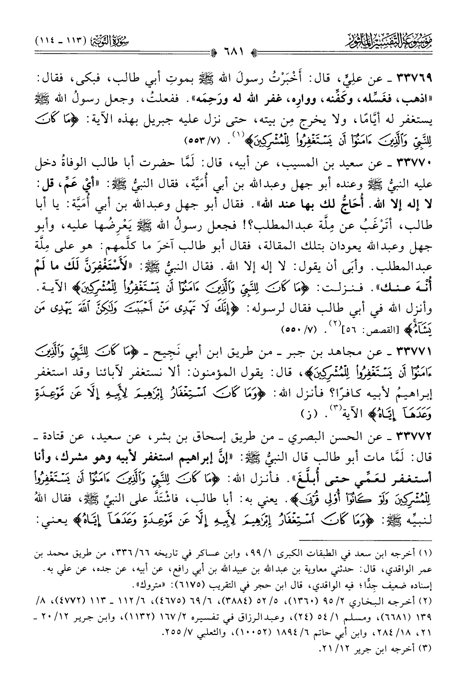 ٣٣٧٧٢ - عن الحسن البصري -من طريق إسحاق بن بشر، عن سعيد، عن قتادة- قال: لَمّا مات أبو طالب قال النبيُّ - صلى الله عليه وسلم -: «إنّ إبراهيم استغفر لأبيه وهو مشرك، وأنا أستغفر لعَمِّي حتى أُبلَّغَ». فأنزل الله: {ما كان للنبى والذين آمنوا أن يستغفروا للمشركين ولو كانوا أولى قربى}. يعني به: أبا طالب، فاشْتَدَّ على النبيِّ - صلى الله عليه وسلم -، فقال اللهُ لنبيه - صلى الله عليه وسلم -: {وما كان استغفار إبراهيم لأبيه إلا عن موعدة وعدها إياه} يعني: