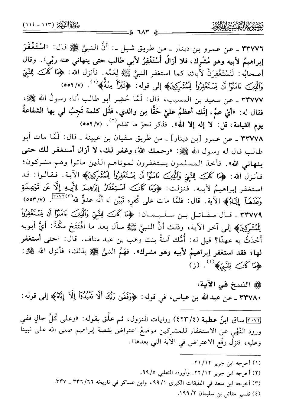 ٣٣٧٧٦ - عن عمرو بن دينار -من طريق شبل- أنّ النبيَّ - صلى الله عليه وسلم - قال: «اسْتَغْفَرَ إبراهيمُ لأبيه وهو مُشْرِك، فلا أزالُ أسْتَغْفِرُ لأبي طالب حتى ينهاني عنه ربِّي». وقال أصحابُه: لَنَسْتَغْفِرَنَّ لآبائنا كما استغفر النبيُّ - صلى الله عليه وسلم - لِعَمِّه. فأنزل الله: {ما كان للنبى والذين آمنوا أن يستغفروا للمشركين} إلى قوله: {تبرأ منه} (¬١). (٧/ ٥٥٢)