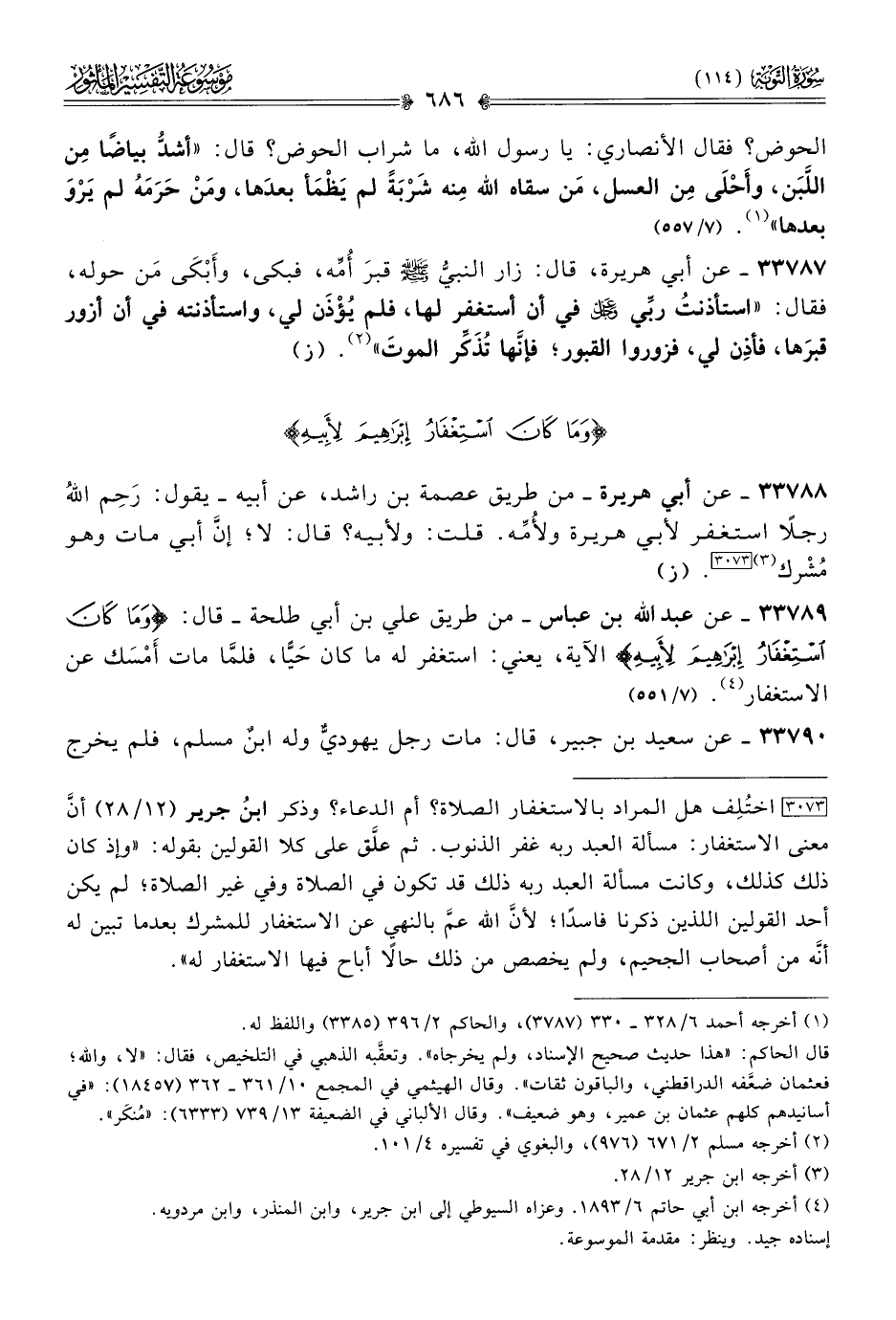 ٣٣٧٨٩ - عن عبد الله بن عباس -من طريق علي بن أبي طلحة- قال: {وما كان استغفار إبراهيم لأبيه} الآية، يعني: استغفر له ما كان حَيًّا، فلمّا مات أمْسَك عن الاستغفار (¬٤). (٧/ ٥٥١)