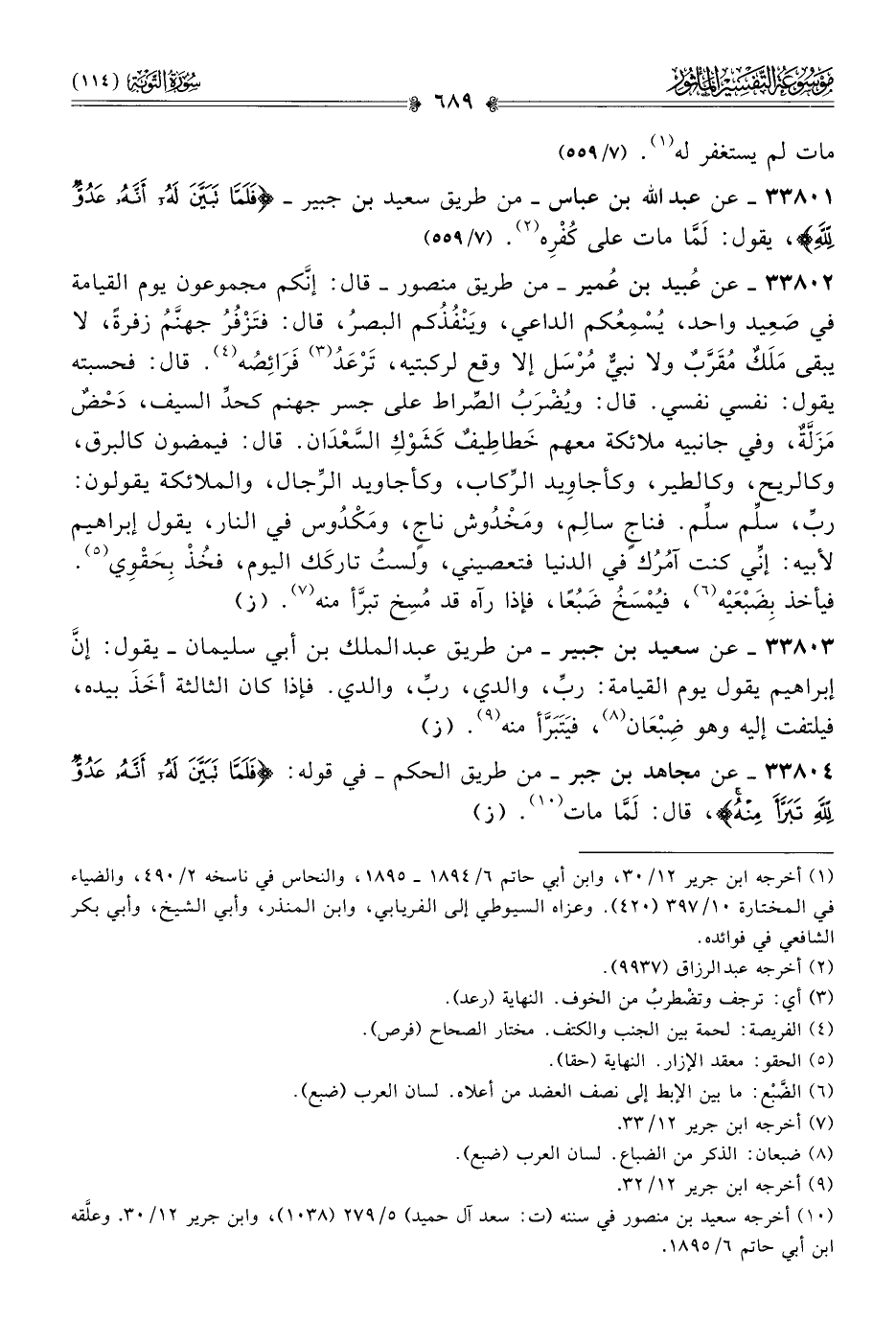 ٣٣٨٠٤ - عن مجاهد بن جبر -من طريق الحكم- في قوله: {فلما تبين له أنه عدو لله تبرأ منه}، قال: لَمّا مات (¬١٠). (ز)