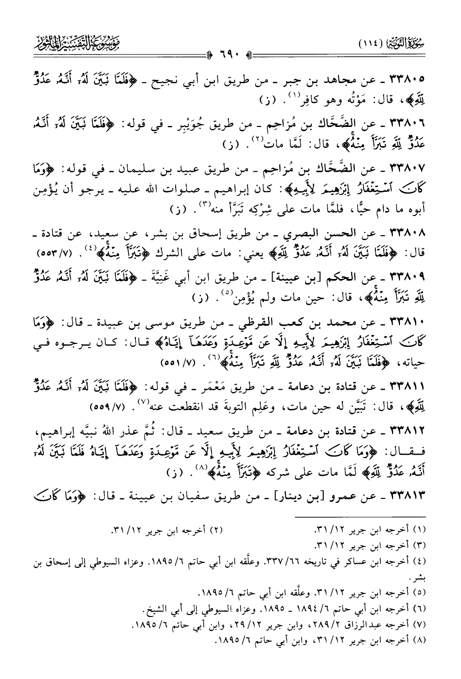 ٣٣٨١٠ - عن محمد بن كعب القرظي -من طريق موسى بن عبيدة- قال: {وما كان استغفار إبراهيم لأبيه إلا عن موعدة وعدها إياه} قال: كان يرجوه في حياته، {فلما تبين له أنه عدو لله تبرأ منه} (¬٦). (٧/ ٥٥١)