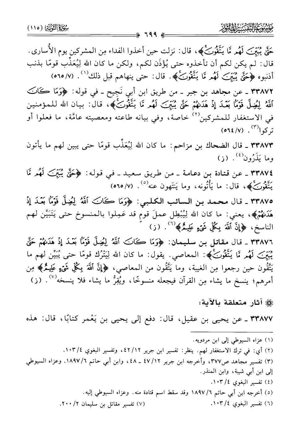 ٣٣٨٧٢ - عن مجاهد بن جبر -من طريق ابن أبي نَجِيح- في قوله: {وما كان الله ليضل قومًا بعد إذ هداهم حتى يبين لهم ما يتقون}، قال: بيان الله للمؤمنين في الاستغفار للمشركين (¬٢) خاصة، وفى بيانه طاعته ومعصيته عامَّة، ما فعلوا أو تركوا (¬٣). (٧/ ٥٦٤)