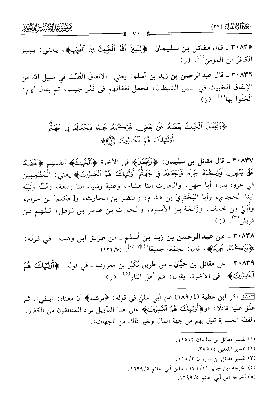 ٣٠٨٣٧ - قال مقاتل بن سليمان: {ويَجْعَلَ} في الآخرة {الخَبِيثَ} أنفسهم {بَعْضَهُ عَلى بَعْضٍ فَيَرْكُمَهُ جَمِيعًا فَيَجْعَلَهُ فِي جَهَنَّمَ أُولَئِكَ هُمُ الخاسِرُونَ} يعني: المُطْعِمِين في غزوة بدر؛ أبا جهل، والحارث ابنا هشام، وعتبة وشيبة ابنا ربيعة، ومُنَبِّه ونُبَيْه ابنا الحجاج، وأبا البَخْتَرِيِّ بن هشام، والنضر بن الحارث، و [حكيم] بن حزام، وأُبَيَّ بن خلف، وزَمْعَة بن الأسود، والحارث بن عامر بن نوفل، كلهم من قريش (¬٣). (ز)