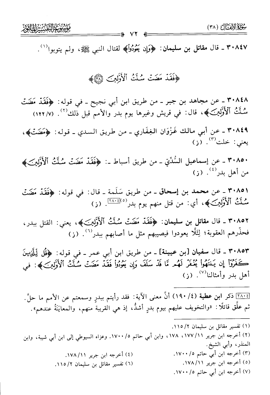 ٣٠٨٥١ - عن محمد بن إسحاق -من طريق سَلَمة- قال: في قوله: {فقد مضت سنة الأولين}، أي: من قتل منهم يوم بدر (¬٥) [٢٨٠٤]. (ز)