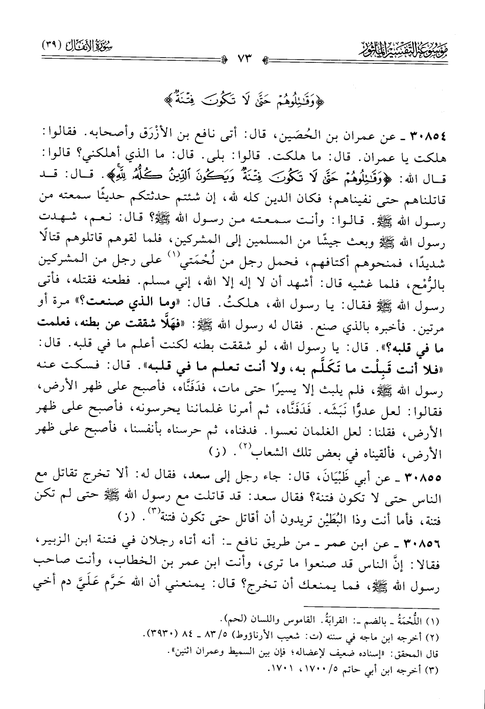 ٣٠٨٥٤ - عن عمران بن الحُصَين، قال: أتى نافع بن الأزْرَق وأصحابه. فقالوا: هلكت يا عمران. قال: ما هلكت. قالوا بلى. قال: ما الذي أهلكني؟ قالوا: قال الله: {وقاتِلُوهُمْ حَتّى لا تَكُونَ فِتْنَةٌ ويَكُونَ الدِّينُ كُلُّهُ لِلَّهِ}. قال: قد قاتلناهم حتى نفيناهم؛ فكان الدين كله لله، إن شئتم حدثتكم حديثًا سمعته من رسول الله - صلى الله عليه وسلم -. قالوا: وأنت سمعته من رسول الله - صلى الله عليه وسلم -؟ قال: نعم، شهدت رسول الله - صلى الله عليه وسلم - وبعث جيشًا من المسلمين إلى المشركين، فلما لقوهم قاتلوهم قتالًا شديدًا، فمنحوهم أكتافهم، فحمل رجل من لُحْمَتي (¬١) على رجل من المشركين بالرُّمْح، فلما غشيه قال: أشهد أن لا إله إلا الله، إني مسلم. فطعنه فقتله، فأتى رسول الله - صلى الله عليه وسلم - فقال: يا رسول الله، هلكتُ. قال: «وما الذي صنعت؟» مرة أو مرتين. فأخبره بالذي صنع. فقال له رسول الله - صلى الله عليه وسلم -: «فهَلّا شققت عن بطنه، فعلمت ما في قلبه؟». قال: يا رسول الله، لو شققت بطنه لكنت أعلم ما في قلبه. قال: «فلا أنت قَبِلْت ما تَكَلَّم به، ولا أنت تعلم ما في قلبه». قال: فسكت عنه رسول الله - صلى الله عليه وسلم -، فلم يلبث إلا يسيرًا حتى مات، فدَفَنّاه، فأصبح على ظهر الأرض، فقالوا: لعل عدوًّا نَبَشَه. فَدَفَنّاه، ثم أمرنا غلماننا يحرسونه، فأصبح على ظهر الأرض، فقلنا: لعل الغلمان نعسوا. فدفناه، ثم حرسناه بأنفسنا، فأصبح على ظهر الأرض، فألقيناه في بعض تلك الشعاب (¬٢). (ز)